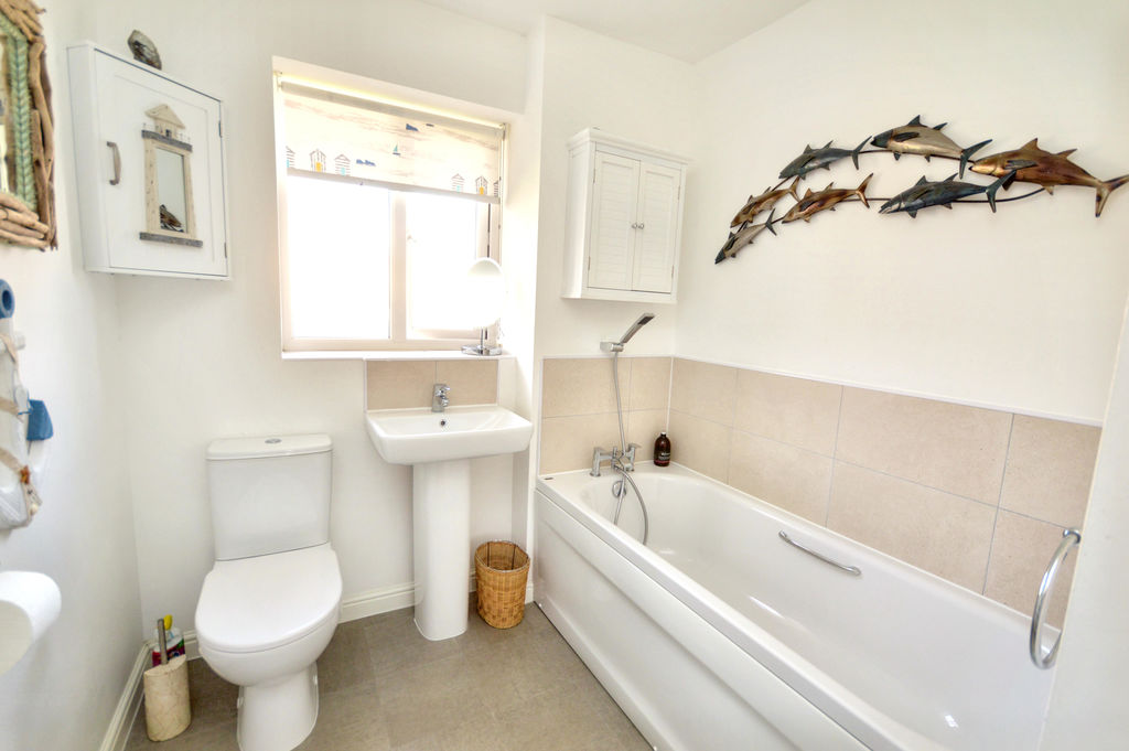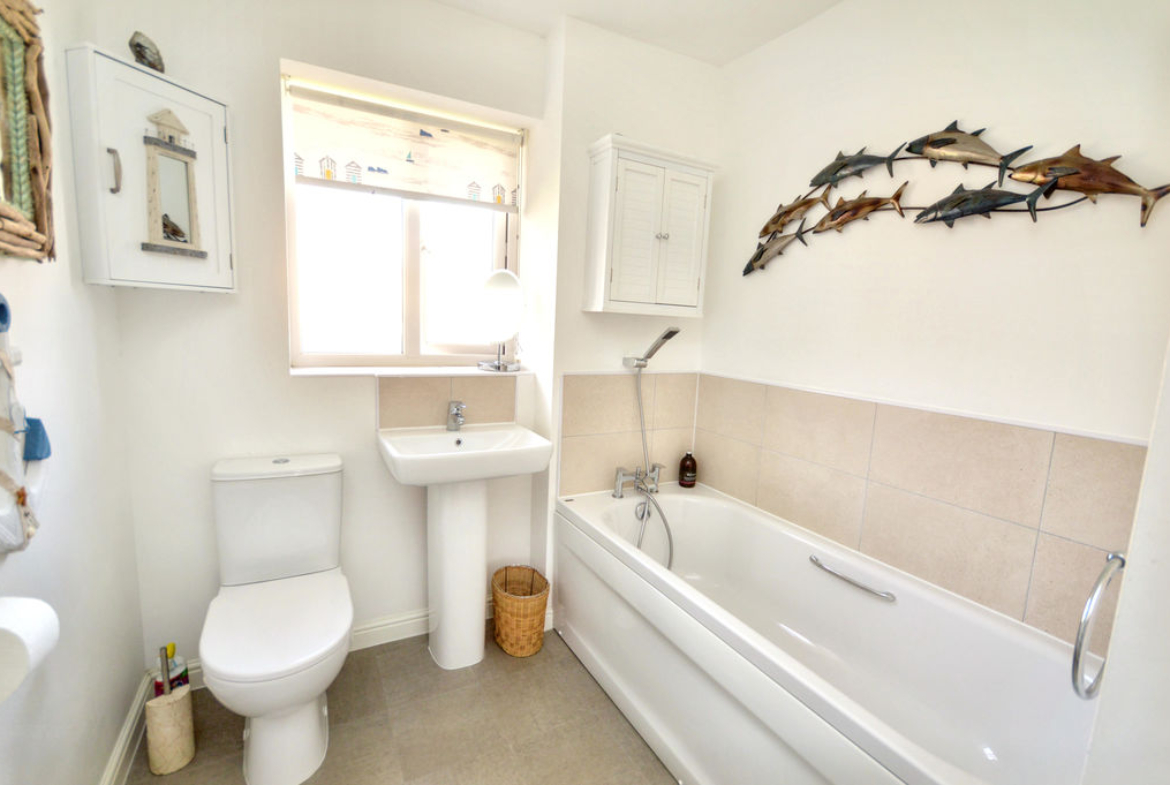 Bath with hand-held shower attachment and tiled surround | Pedestal wash hand-basin with tiled splashback | Close-coupled W.C. | Chrome ladder style radiator | Extractor fan | UPVC double-glazed frosted window