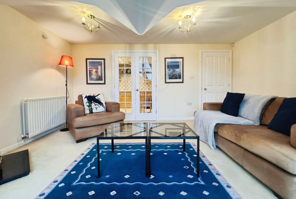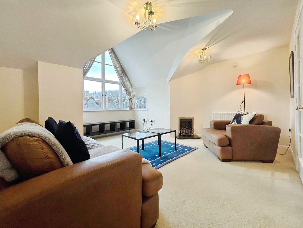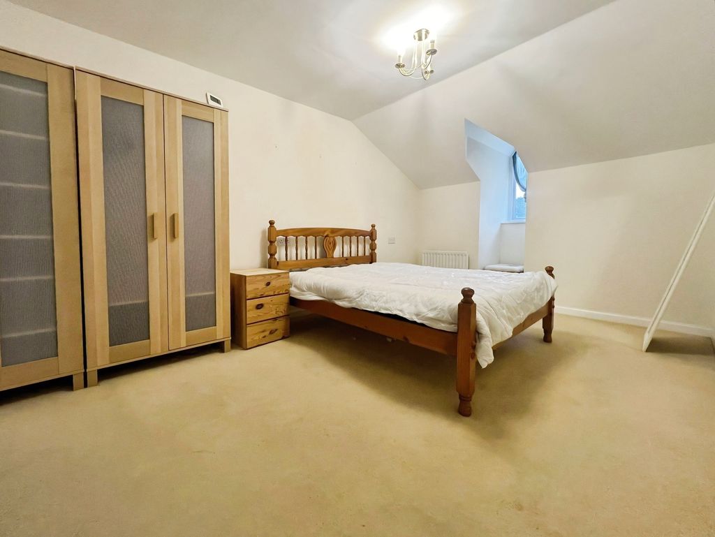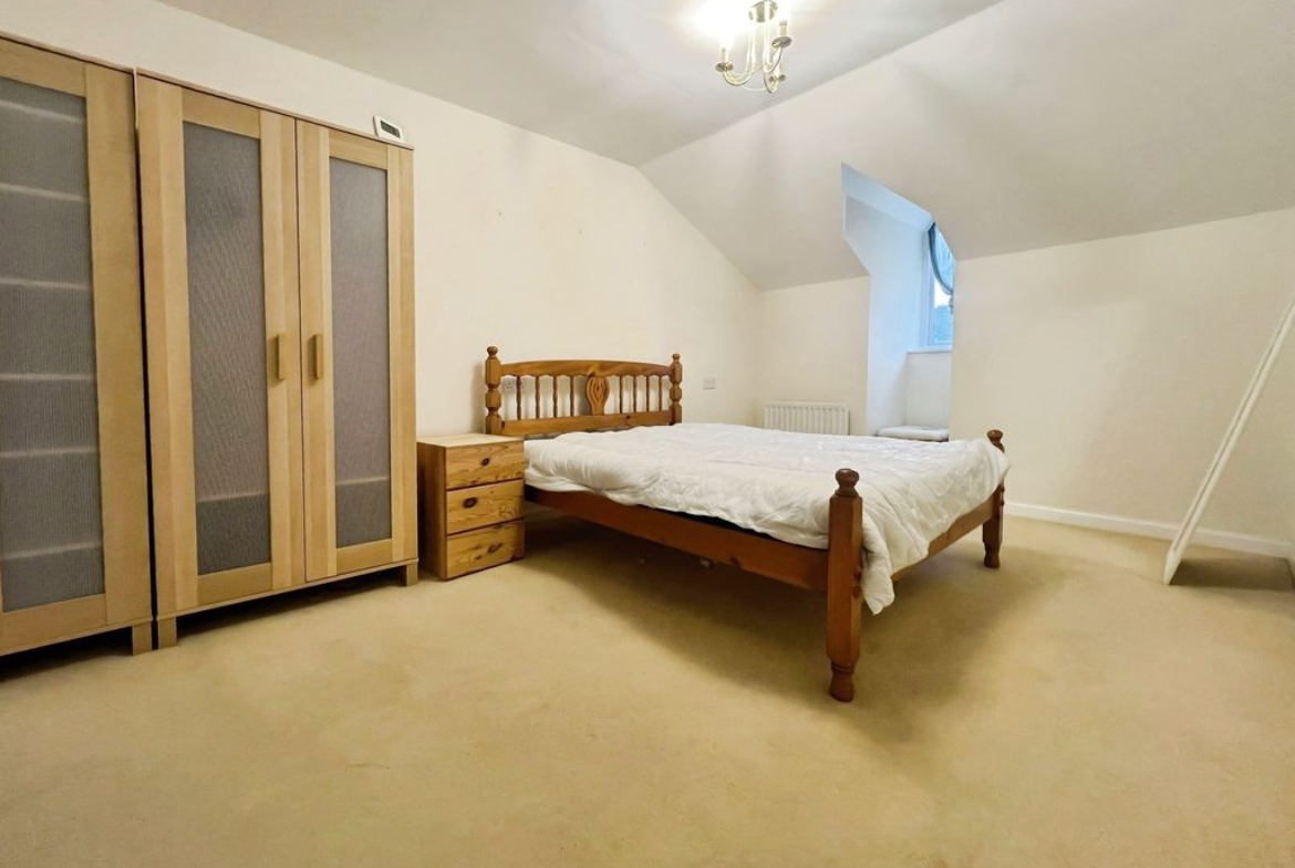 Generous lounge with gable window overlooking the communal gardens and allowing plenty of light into the space. Carpeted flooring, radiator and fireplace.