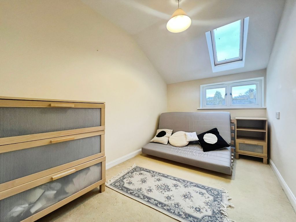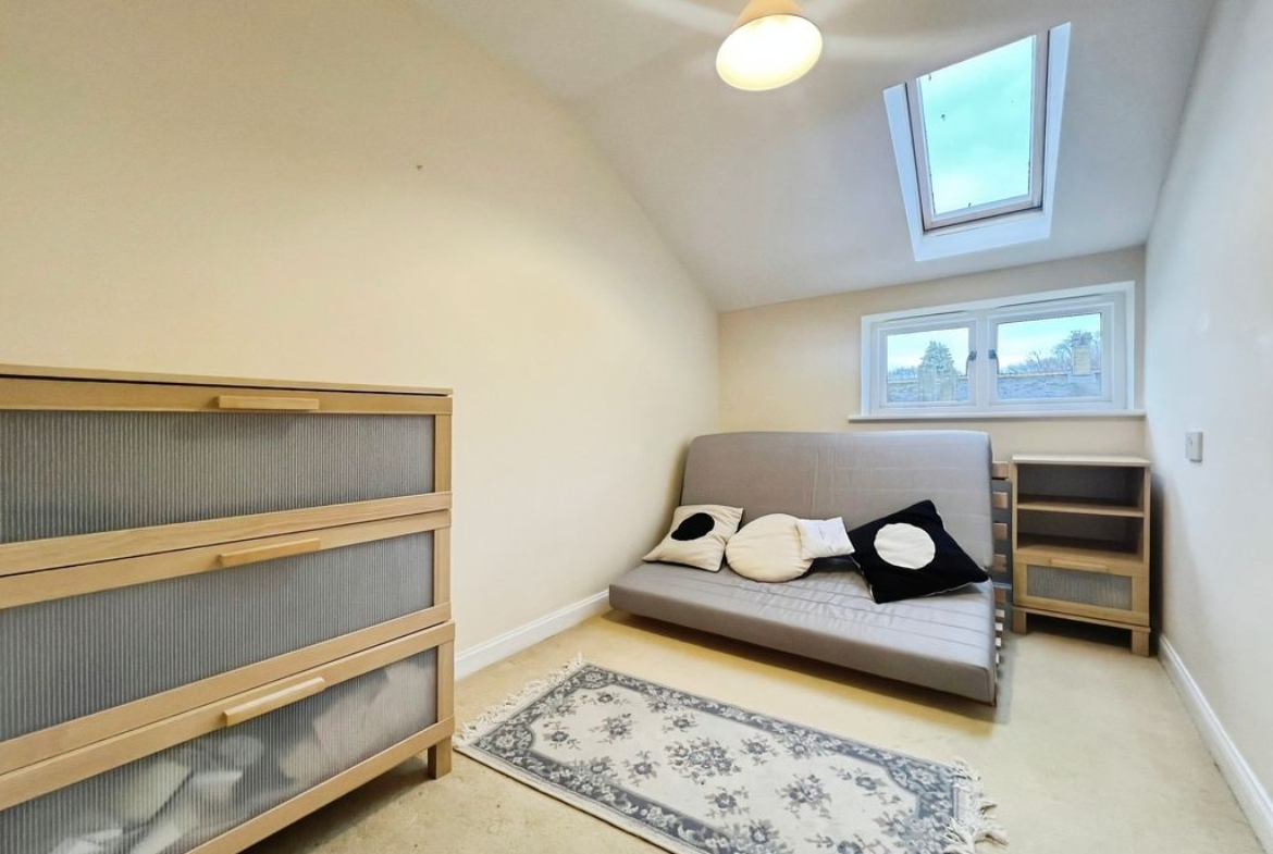 Carpeted bedroom with windows overlooking the gardens and velux window.