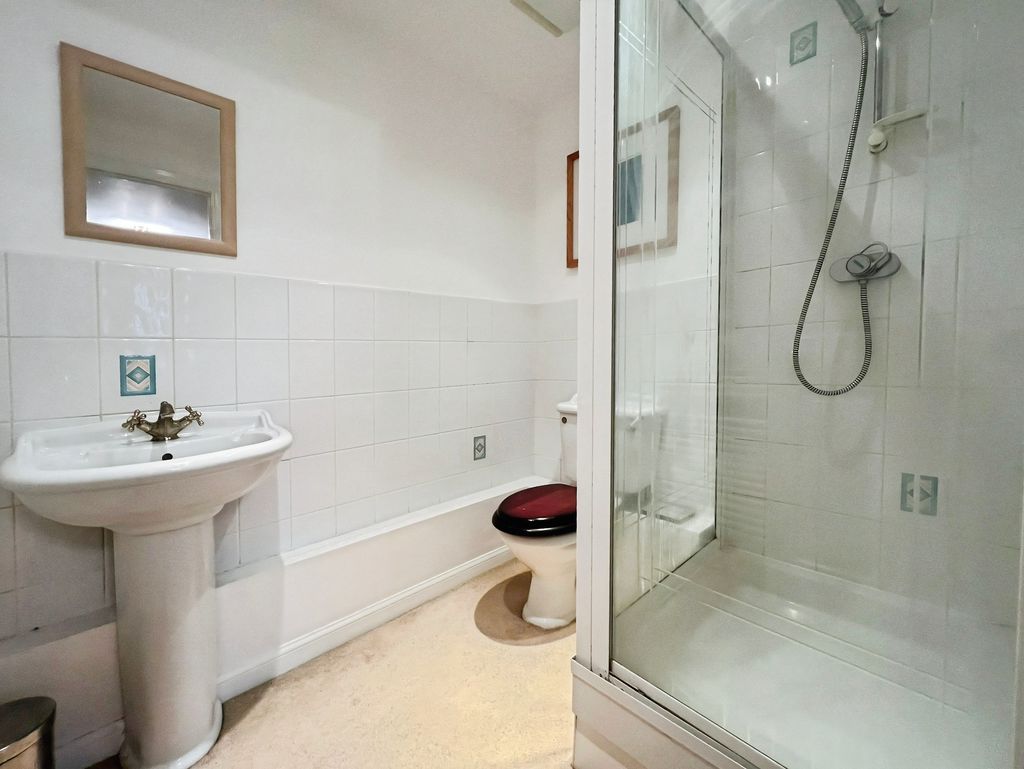 En suite with part tiled walls, low level WC, wash basin and shower cubicle.