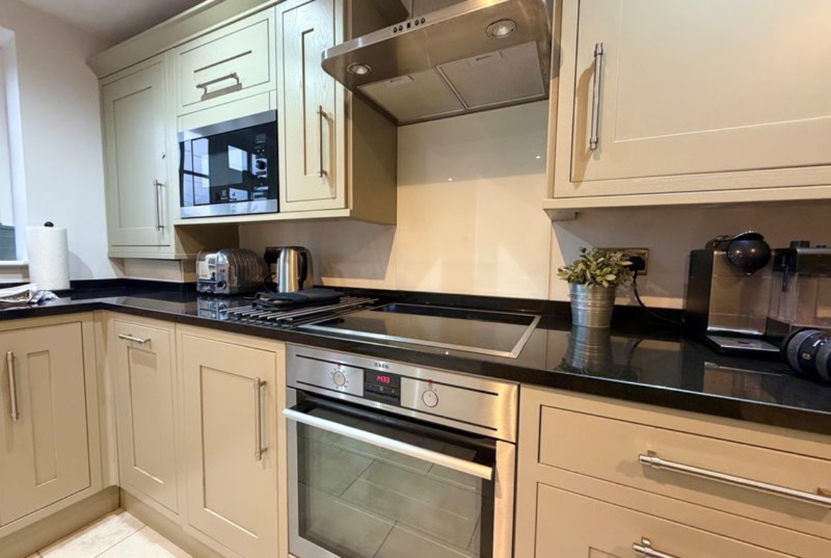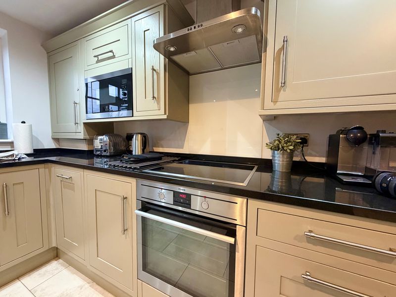 The accommodation is light and well-proportioned throughout. The kitchen is fitted with high-specification units, offering ample storage and integrated appliances, with generous space for dining. Doors open directly onto the impressive rear garden, creating a seamless connection between indoor and outdoor living.