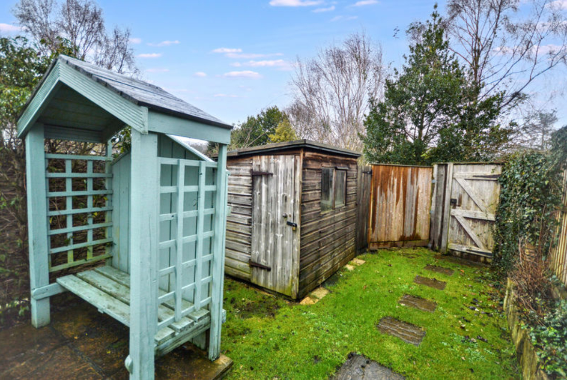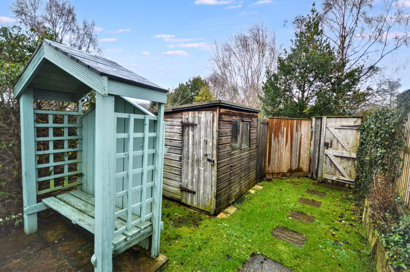 Long rear garden, mainly laid to lawn & a substantial decking area | Garden shed & arbour | Fenced boundaries