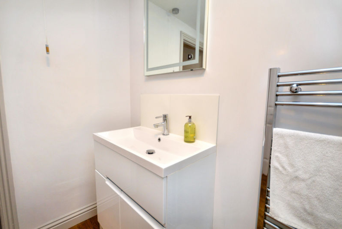 Bath with tiled surround & mains rainfall head shower with a glass screen | Close coupled W.C | Cabinet with integrated wash-hand basin & tiled splashback | Sensor controlled mirror | Extractor fan | Wood floor | Chrome ladder style radiator | Double-glazed frosted window