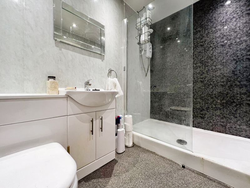 The bathroom houses a large walk-in shower and a heated towel rail, ensuring comfort and warmth on chilly mornings.