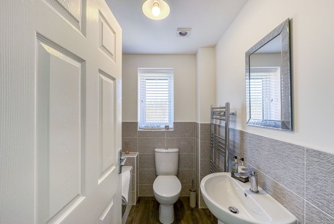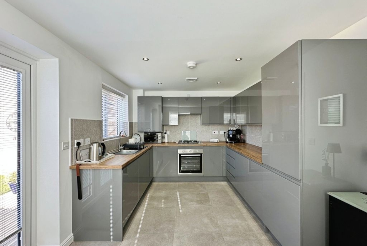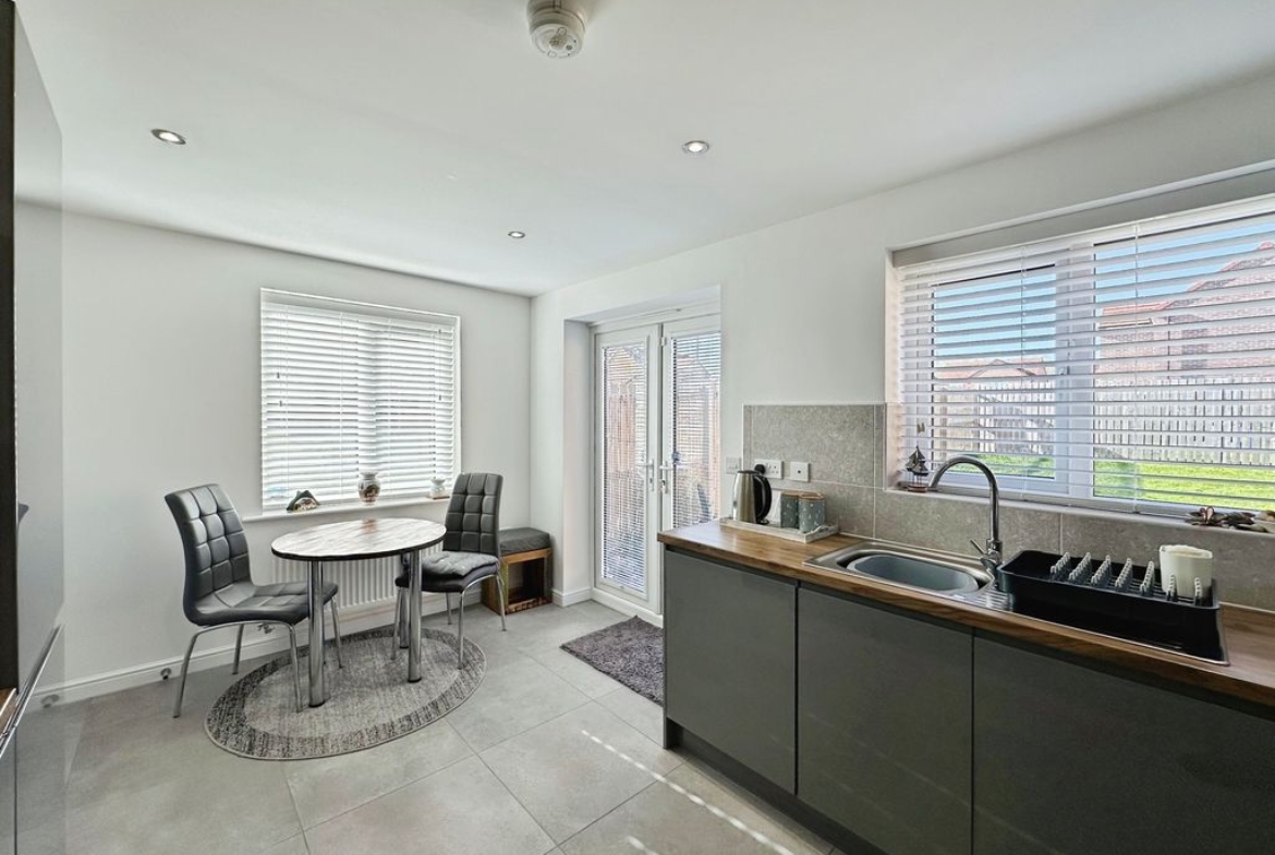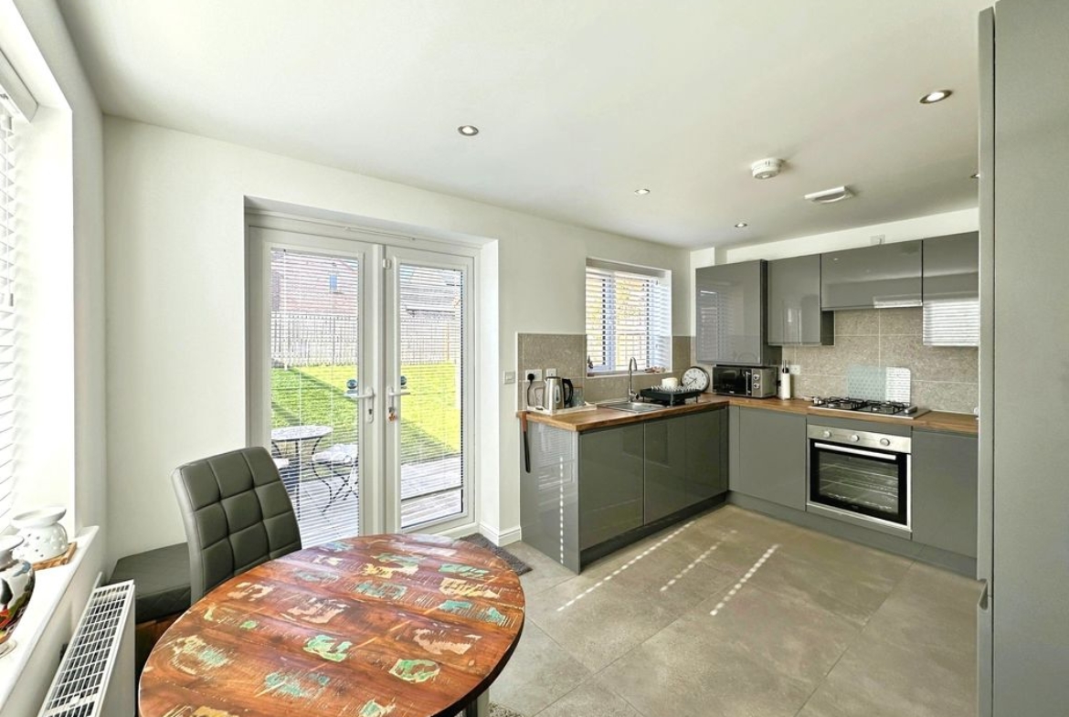 The property briefly comprises: – Entrance hallway which leads you off into a bright and airy lounge, with floods of natural light, due to the double aspect windows overlooking the gardens to the front. The lounge has been finished with grey carpets and complimented with white walls. On the other side of the hallway is a stunning kitchen/diner offering picture perfect views over the garden, and direct access via the double patio doors. The high spec kitchen has been fitted with a range of grey gloss wall and base units, offering an abundance of storage with a wooden bench top. Integrated appliances include; fridge/freezer, dishwasher, washing machine, electric oven, cooker hood and a four-ring gas hob. You further benefit from a downstairs W.C.