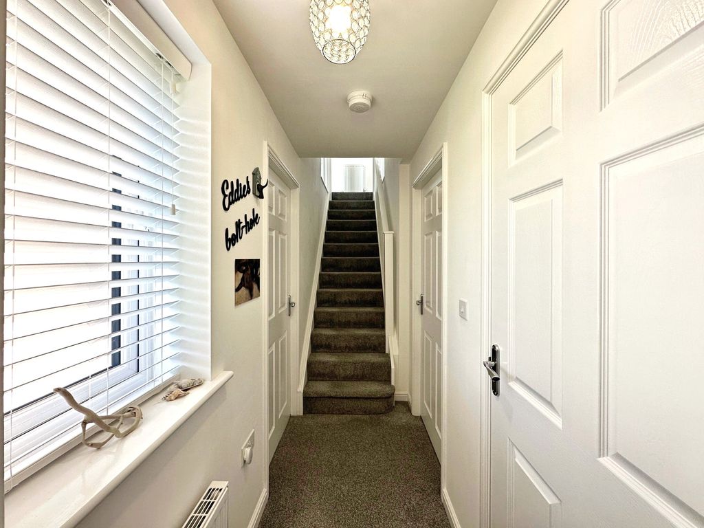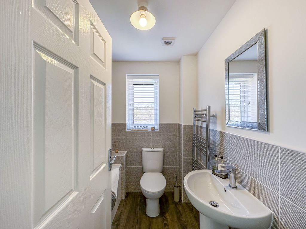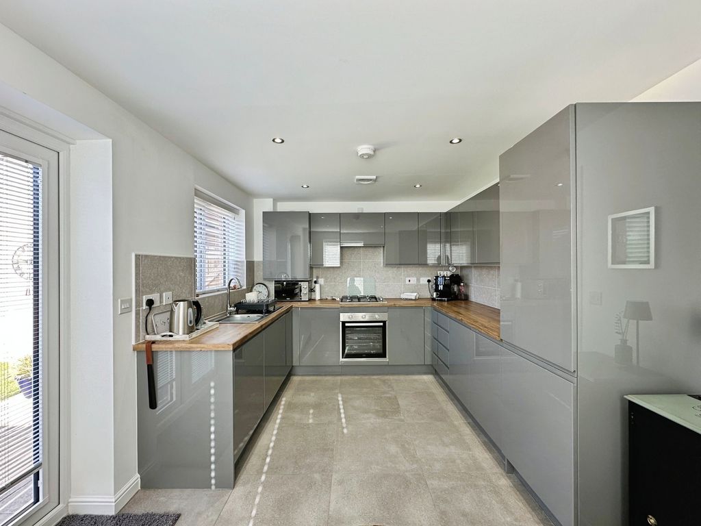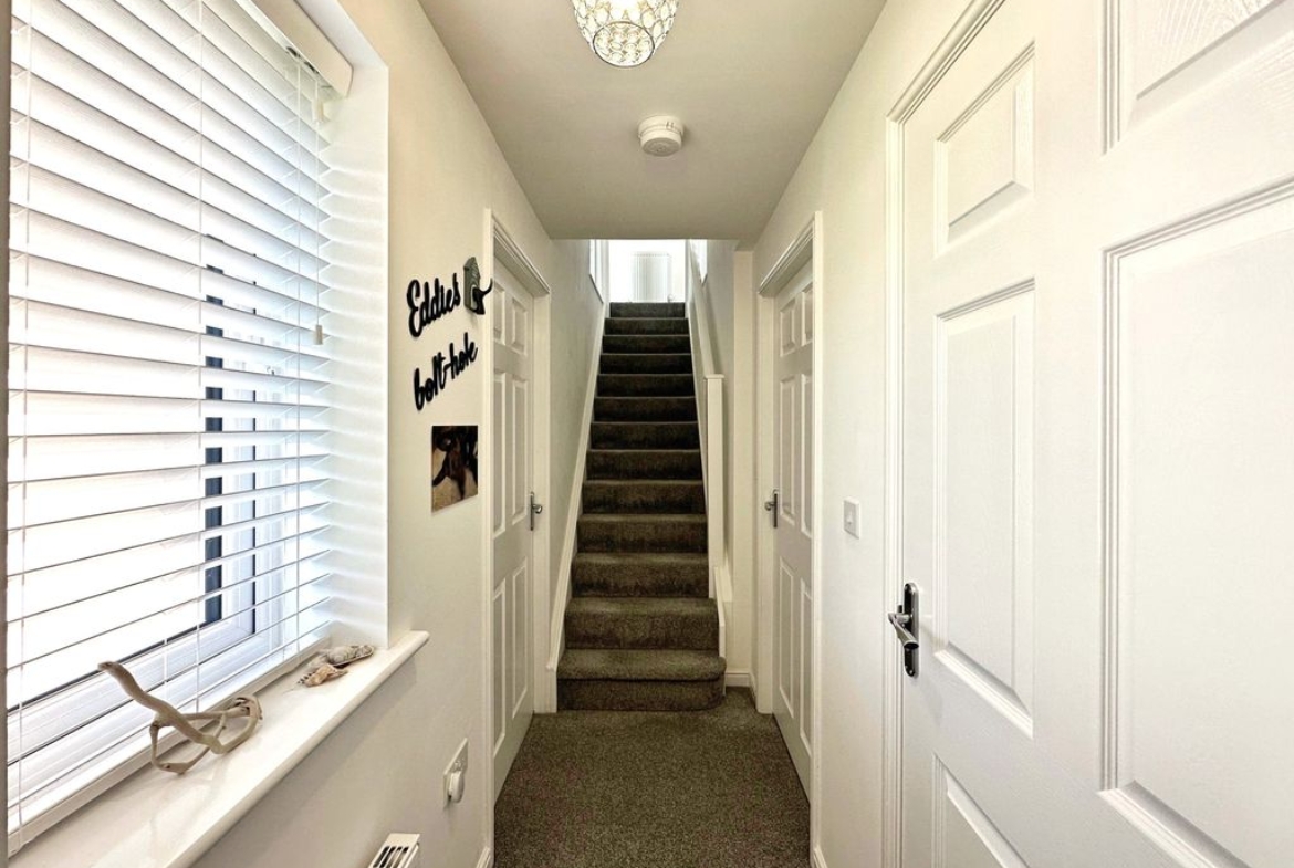 The property briefly comprises: – Entrance hallway which leads you off into a bright and airy lounge, with floods of natural light, due to the double aspect windows overlooking the gardens to the front. The lounge has been finished with grey carpets and complimented with white walls. On the other side of the hallway is a stunning kitchen/diner offering picture perfect views over the garden, and direct access via the double patio doors. The high spec kitchen has been fitted with a range of grey gloss wall and base units, offering an abundance of storage with a wooden bench top. Integrated appliances include; fridge/freezer, dishwasher, washing machine, electric oven, cooker hood and a four-ring gas hob. You further benefit from a downstairs W.C.