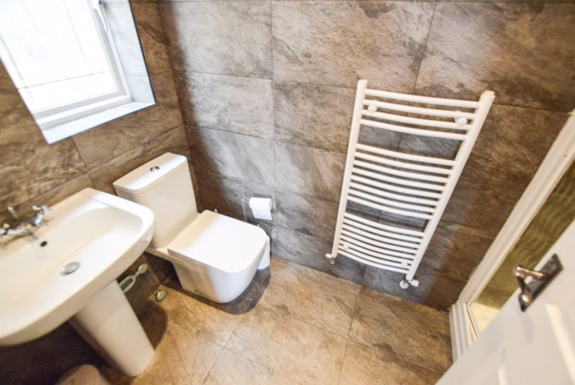 wc, hand basin, shower cubicle, tiling to walls and heated towel