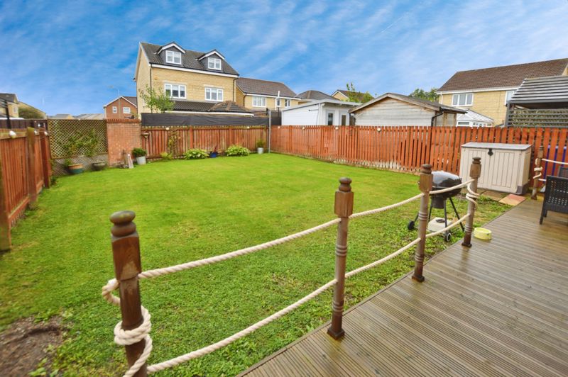 spaces, to the rear the garden is laid mainly to lawn, with a decking