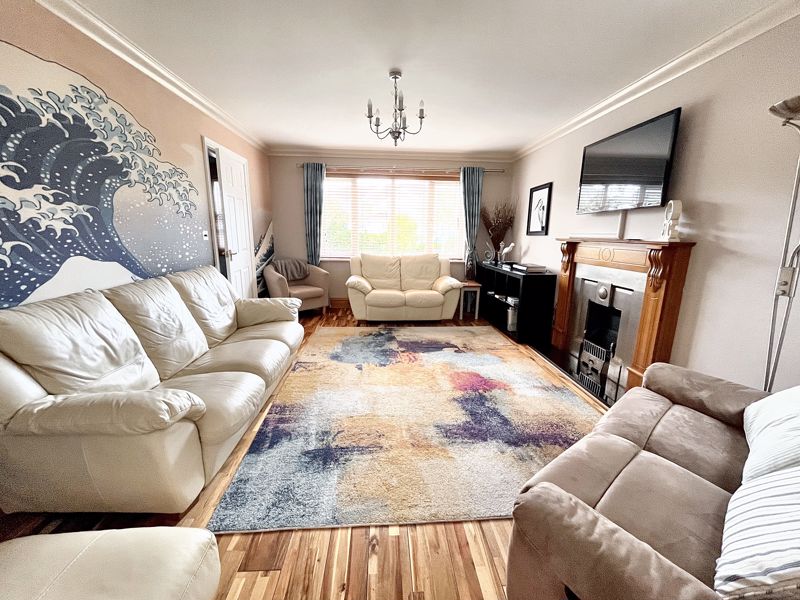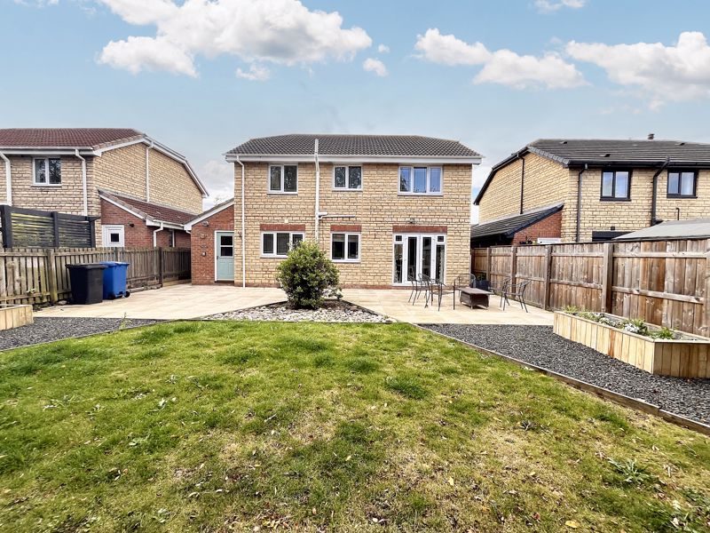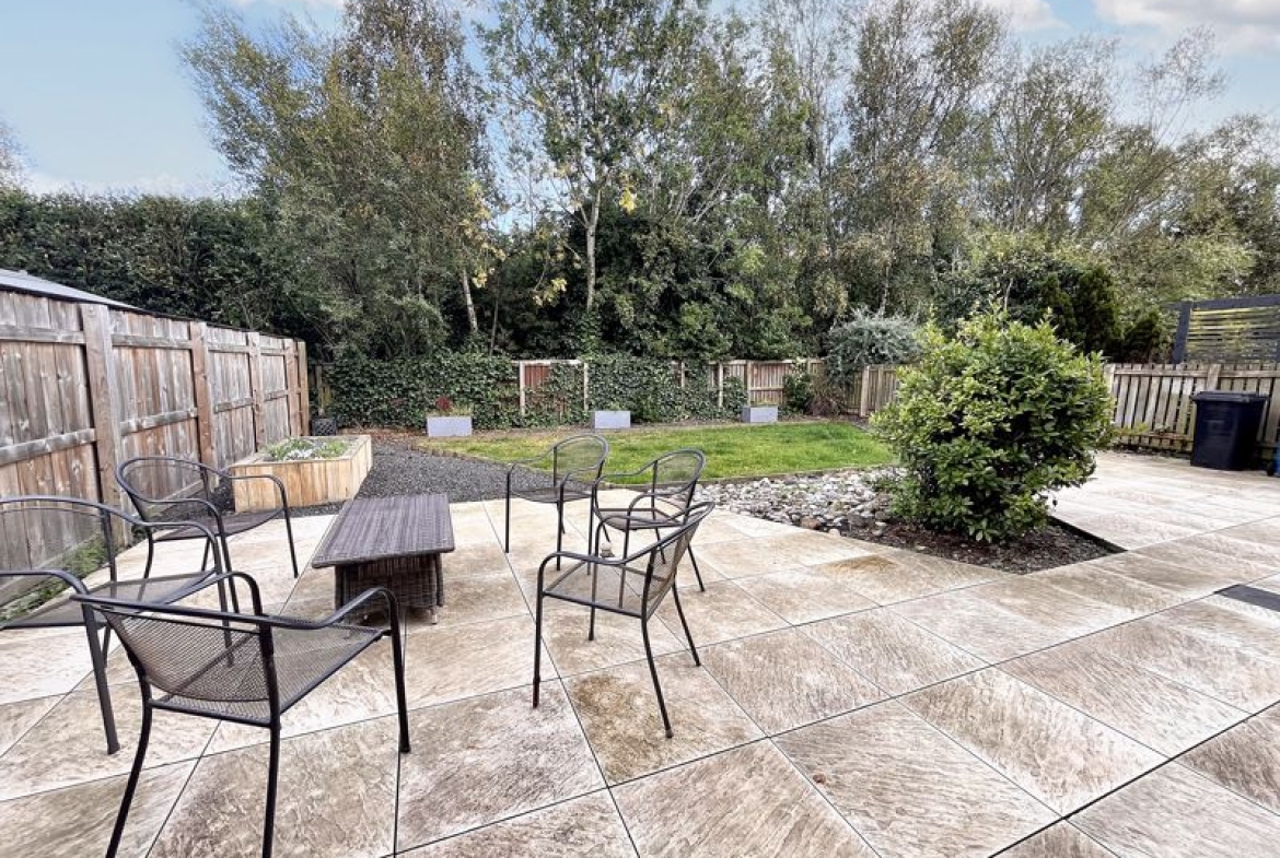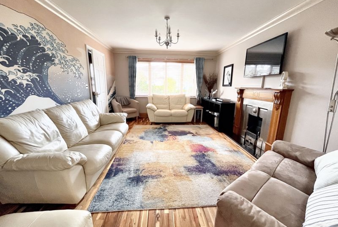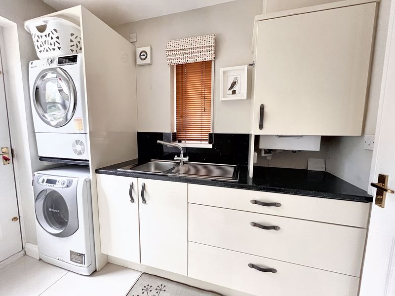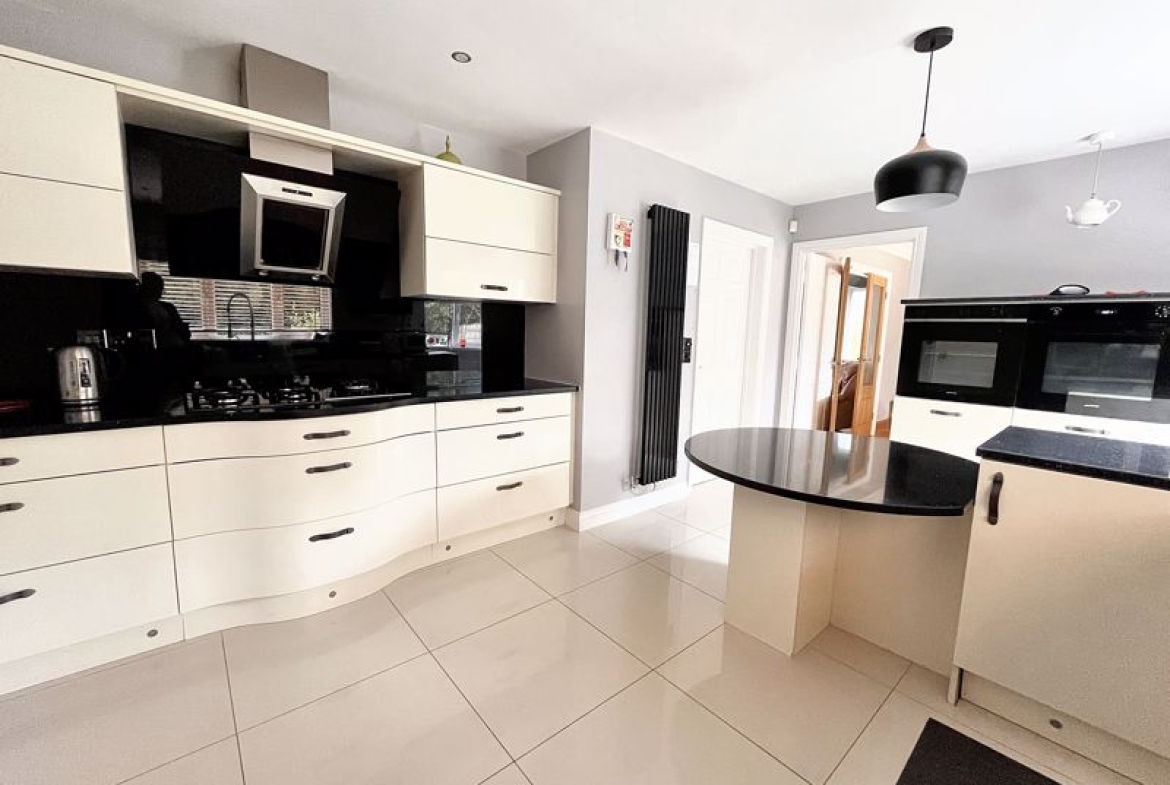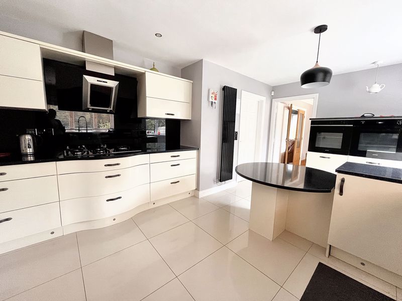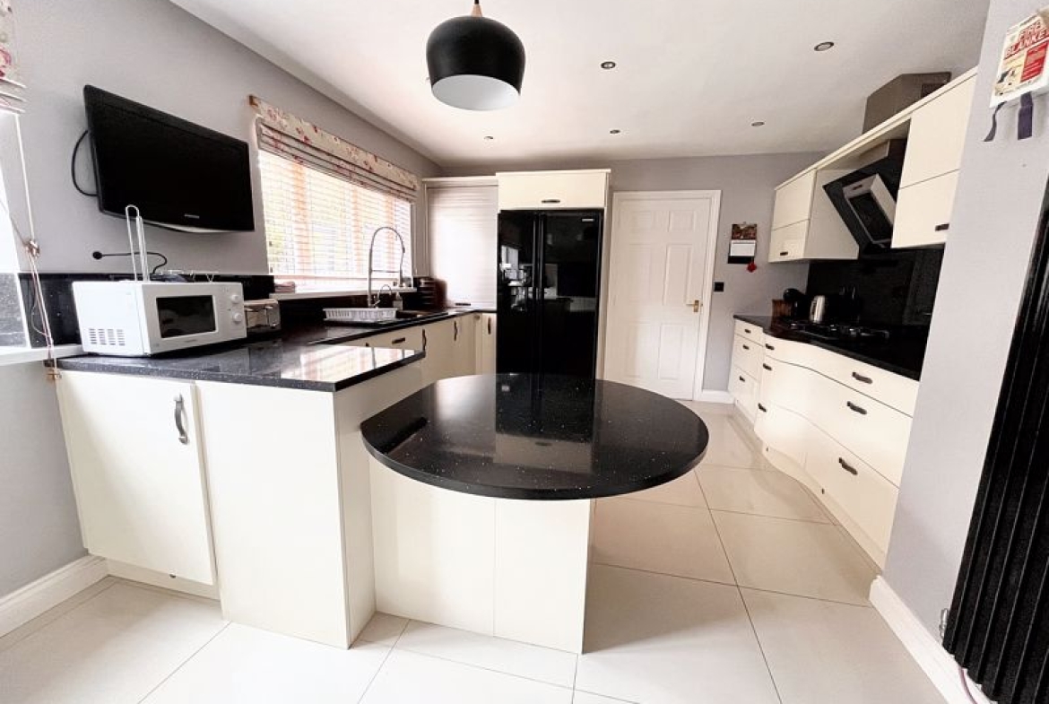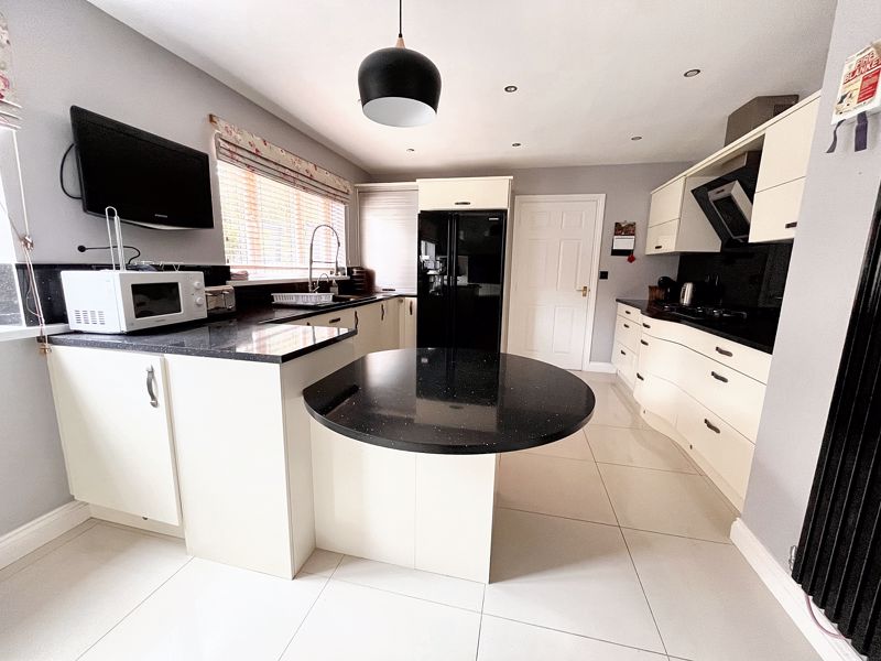 The stylish kitchen is fitted to a high standard with a kitchen island, granite countertops, a dedicated breakfast area, and the convenience of a separate utility room. Four well-appointed bedrooms cater to growing families: the master double bedroom boasts built-in wardrobes and a modern en-suite, two further double bedrooms (one with built-in wardrobes), and a single bedroom also benefitting from built-in storage.