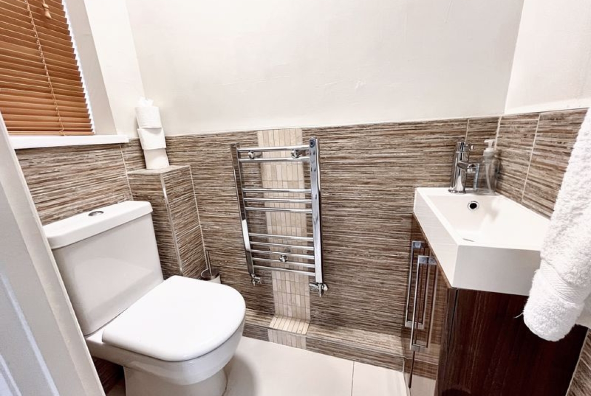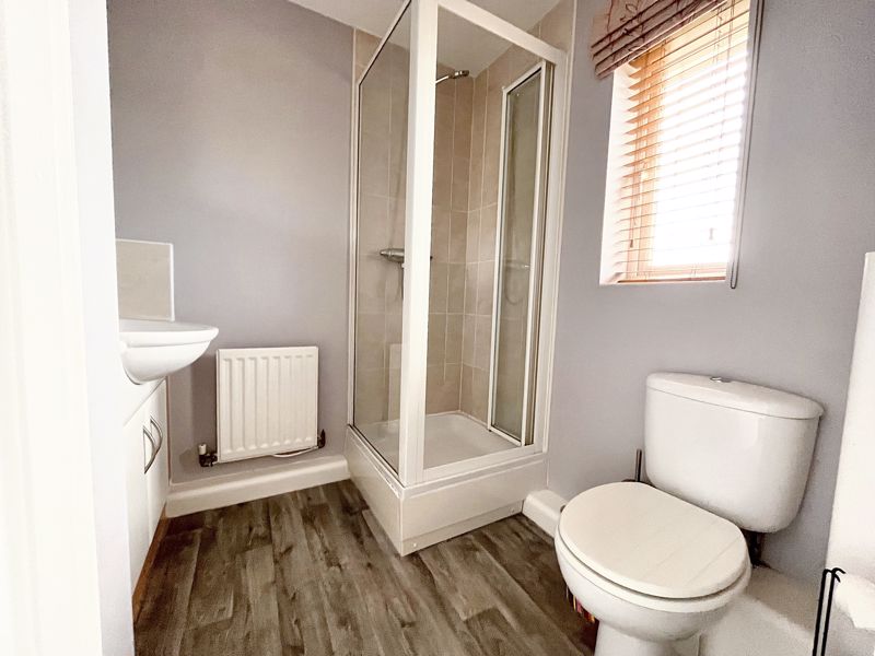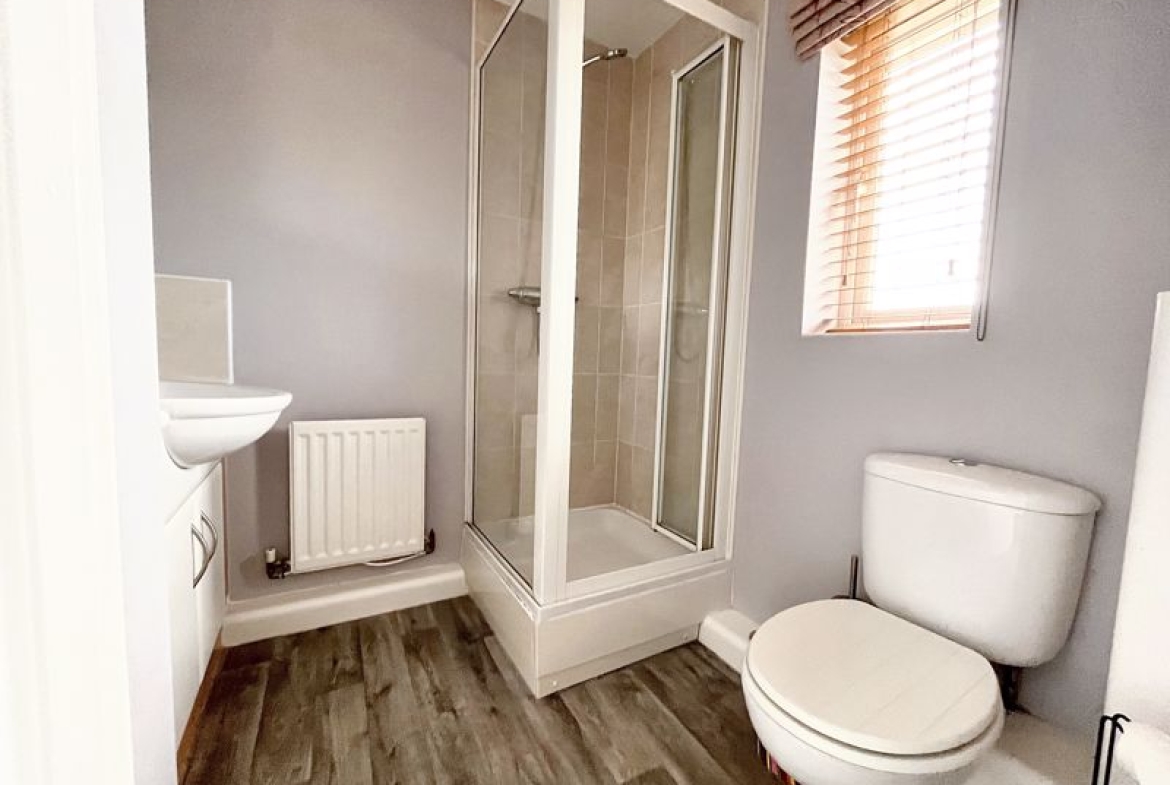 Tiled shower cubicle with a mains shower | Close-coupled W.C. | Fitted cabinet with integrated wash-hand basin