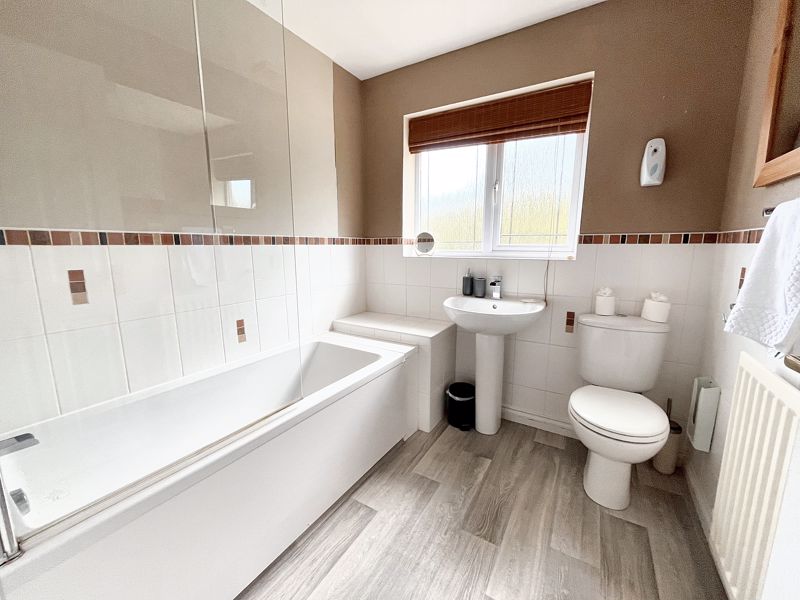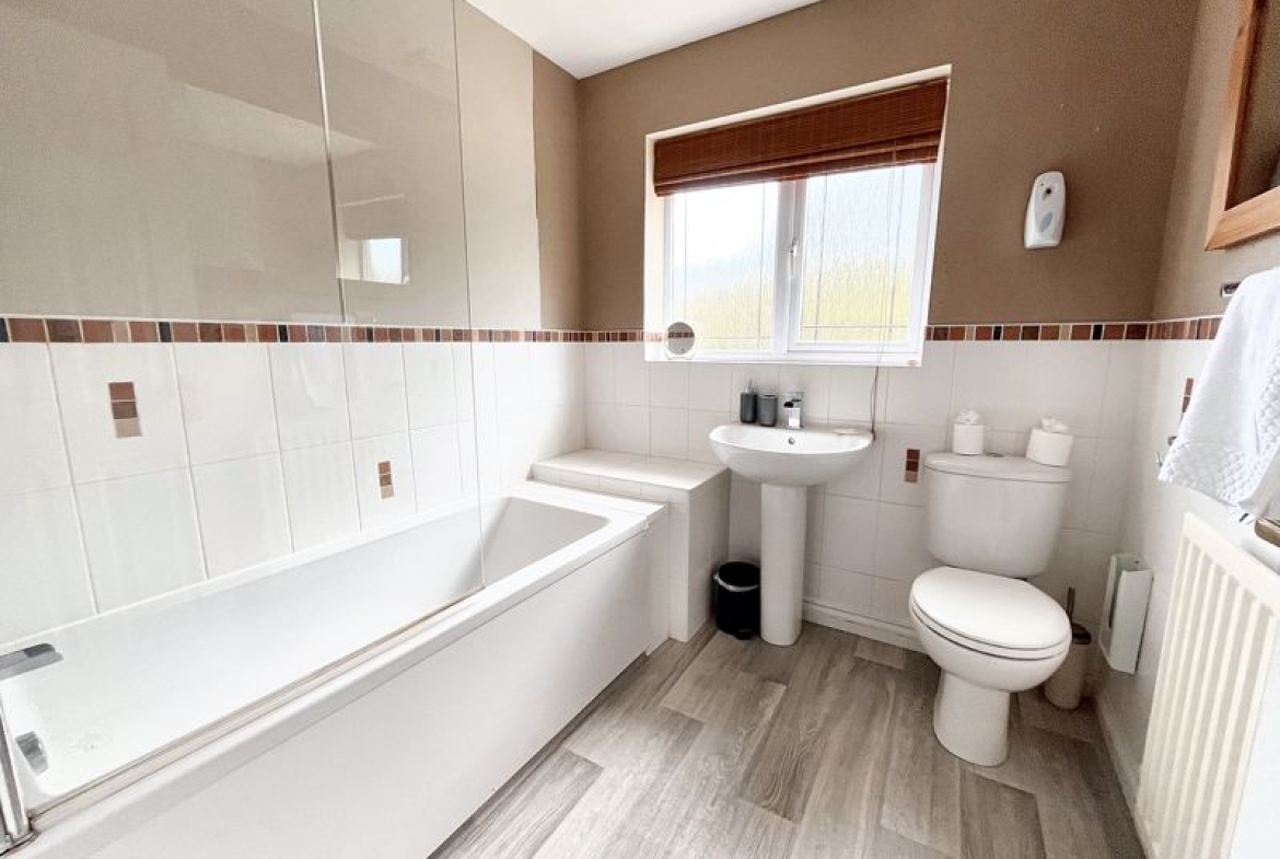 Bath with mains shower over | Pedestal wash-hand basin | Close-coupled W.C.