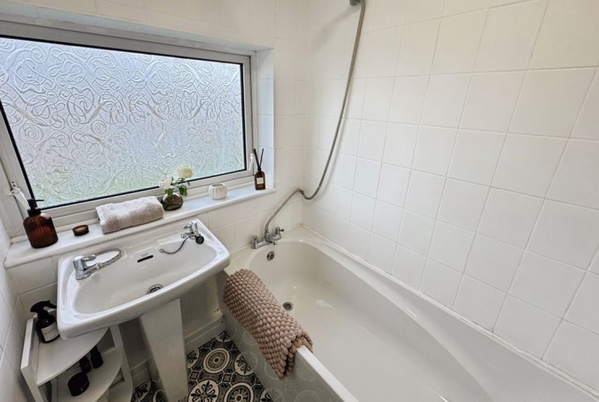 Bath with shower over, wash hand basin, fully tiled and radiator.