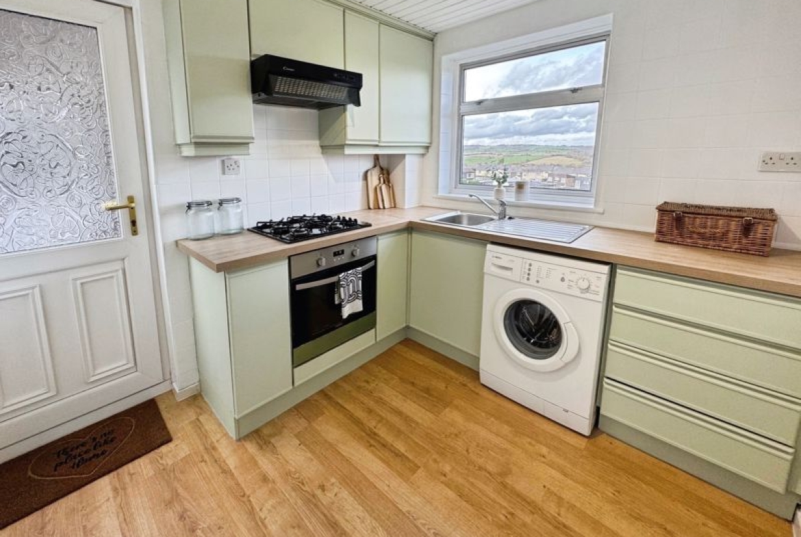 UPVC window, UPVC door, fitted with a range of matching wall and base units with work surfaces above incorporating stainless steel sink unit with drainer, integrated gas hob and electic oven, plumbed for washing machine and radiator.