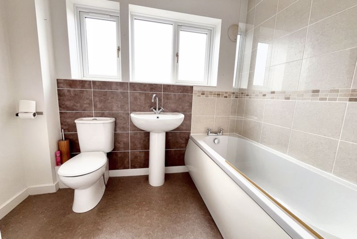 Bath with electric shower and glass screen | Pedestal wash-hand basin | Close-coupled W.C. | Part-tiled walls | Radiator | Ceiling downlights