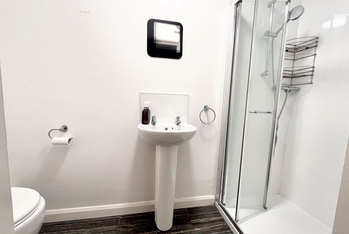 Shower cubicle with wet-wall panels and mains shower | Pedestal wash-hand basin | Close-coupled W.C. | Radiator | Extractor fan
