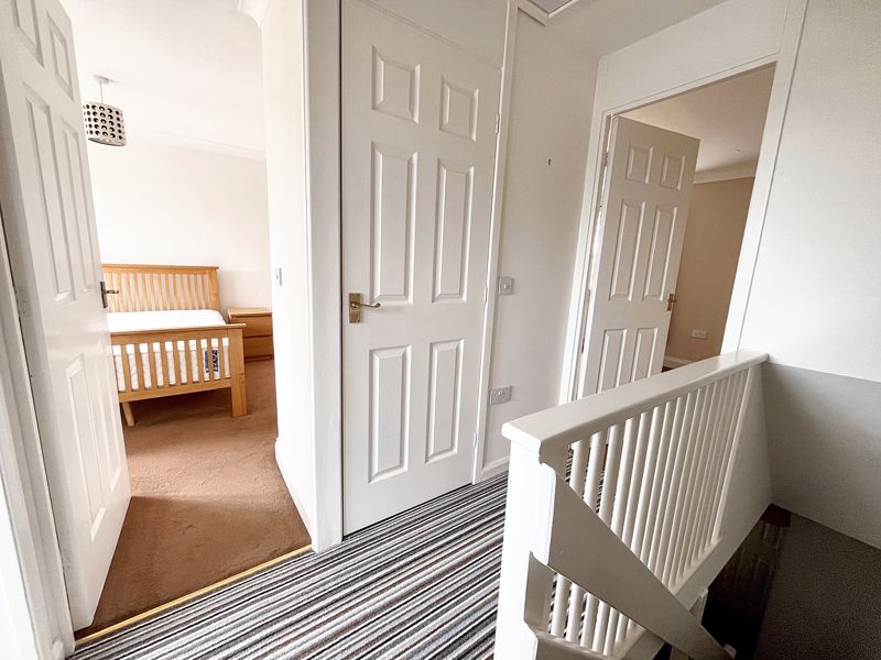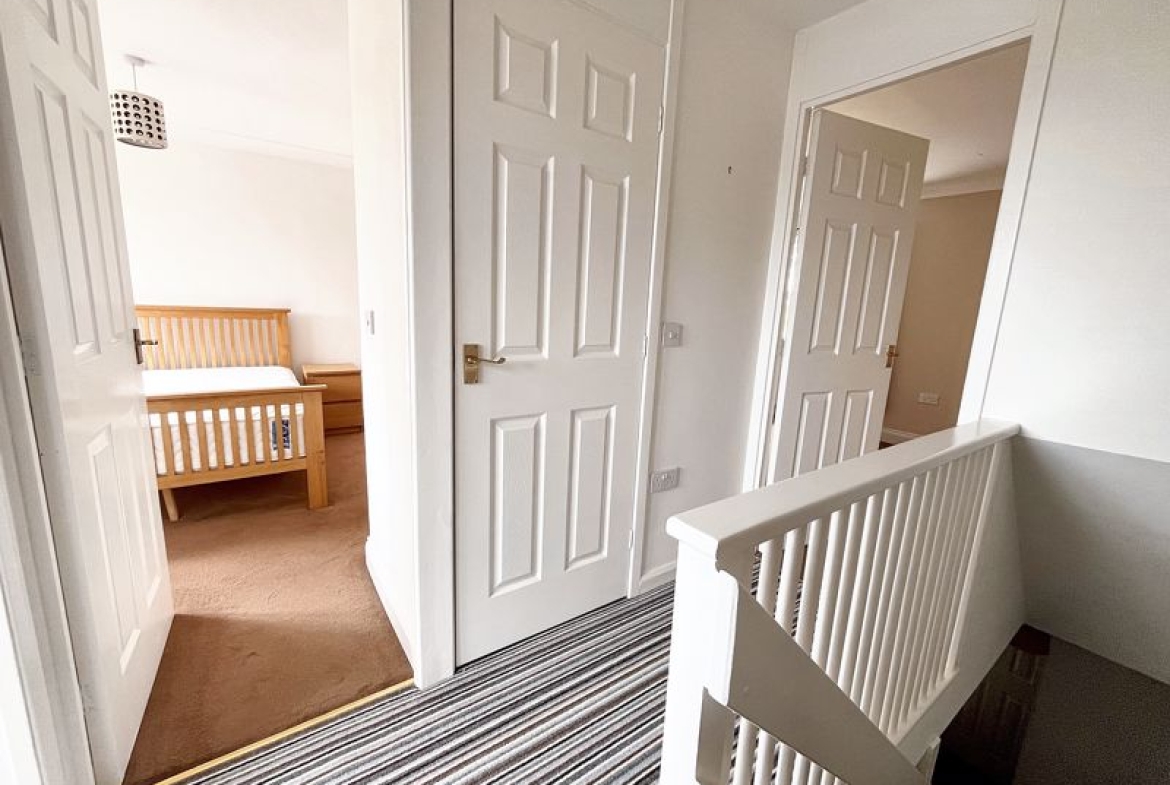 Shelved cupboard housing combi-boiler | Doors to bedrooms and bathroom | Loft access hatch with pull-down ladders (part-boarded loft)