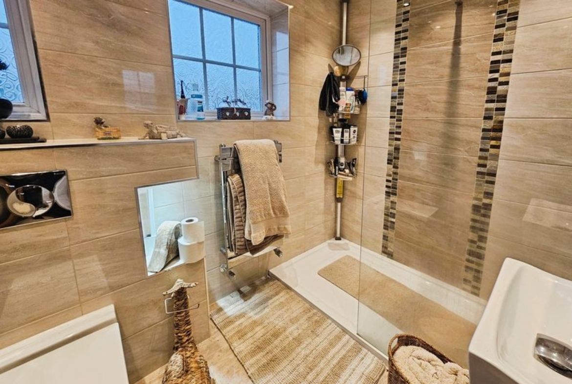 Two double glazed windows to rear, double walk in shower, floating wash hand basin, low level wc, spotlights, heated towel rail, tiling to walls and flooring.