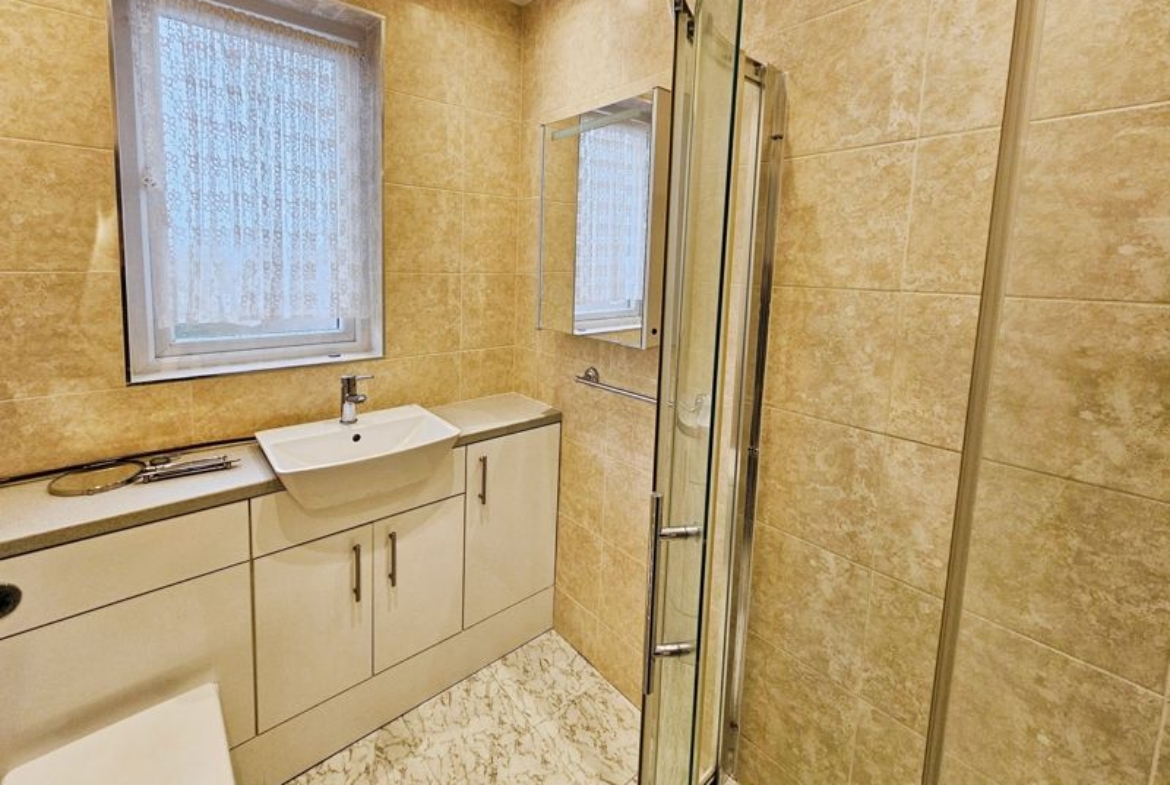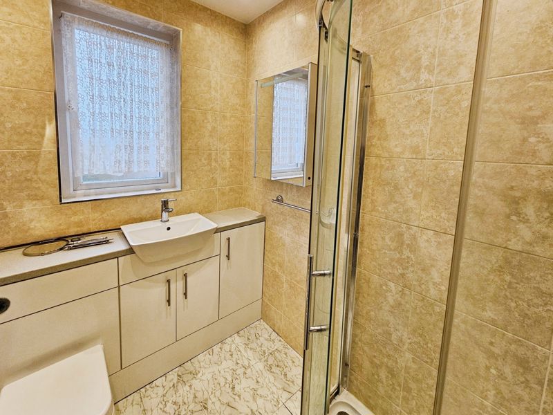 Three-piece white suite comprising of; mains shower cubicle, wash hand basin (set in vanity unit), low level wc, spotlights, double glazed window to front and rear, heated towel rail, tiling to walls and flooring.