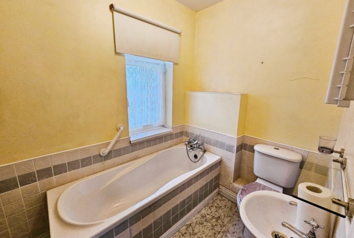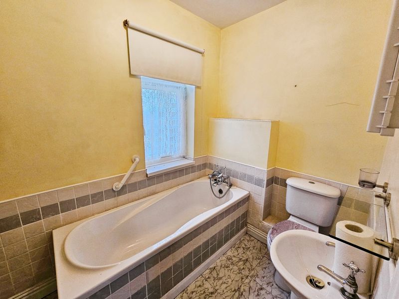 Double glazed window to rear, pedestal wash hand basin, single radiator, extractor fan, panelled bath, part tiling to walls, laminate flooring.