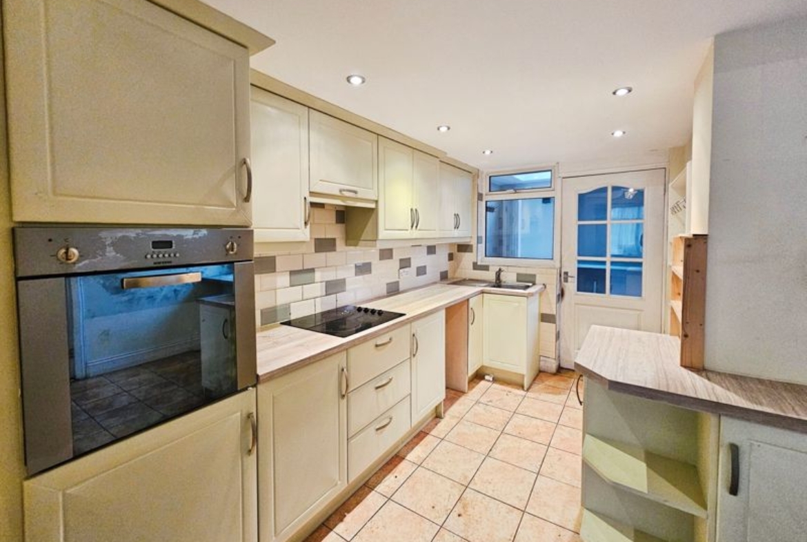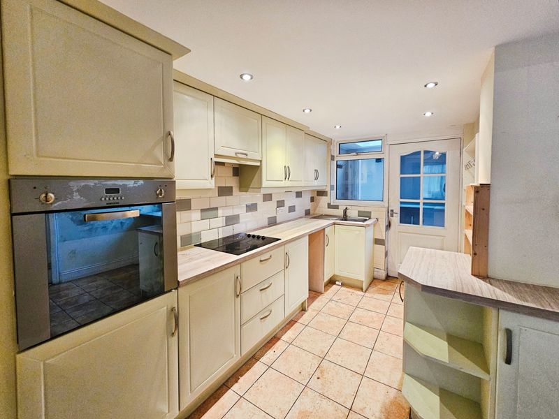Two double glazed windows to rear, single radiator, double radiator, fitted with a range of wall, floor and drawer units with co-ordinating roll edge work surfaces, stainless steel sink unit and drainer with mixer tap, tiled splash backs, built in electric fan assisted oven, electric hob with extractor fan above, space for cooker, tiling to floor, spotlights, wood door to: