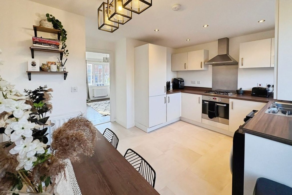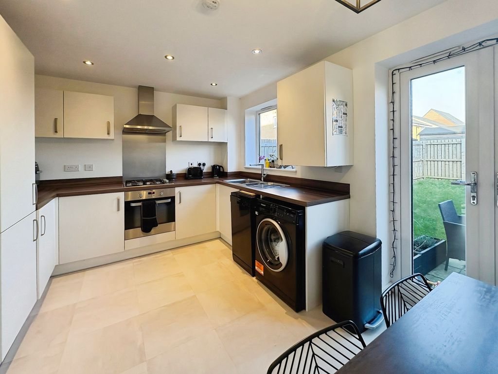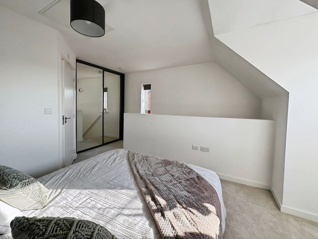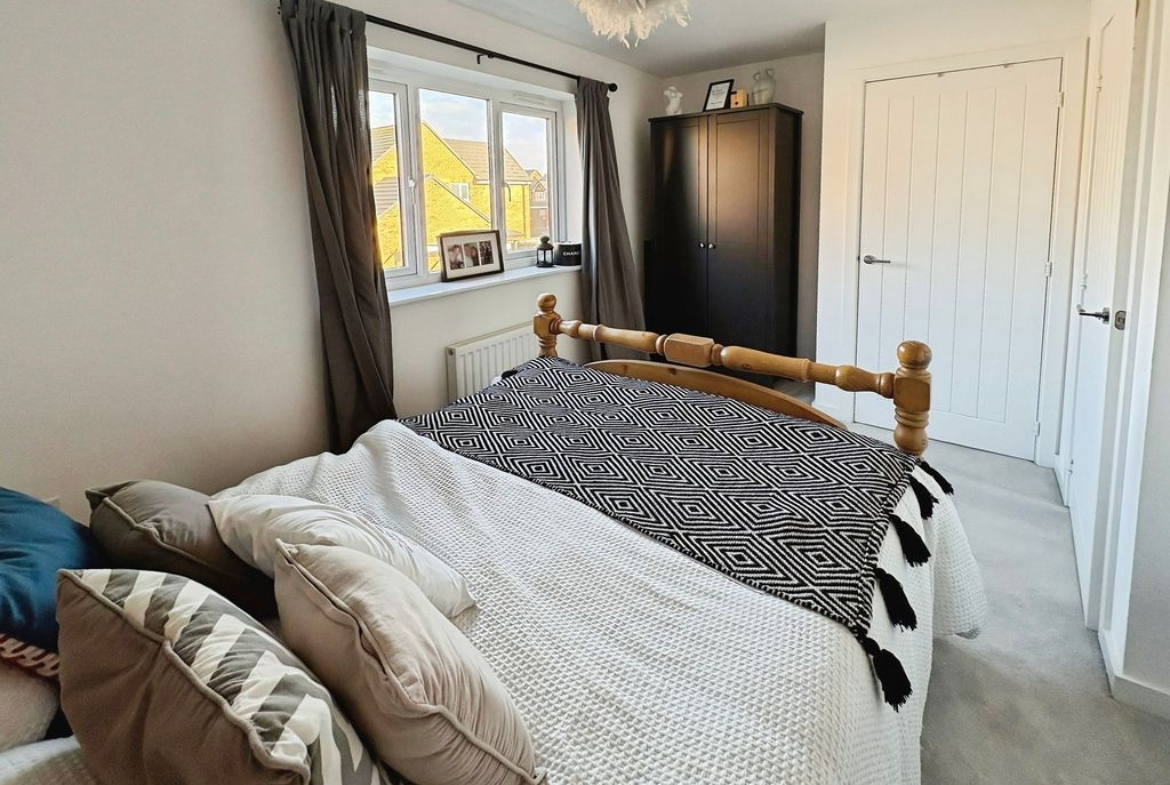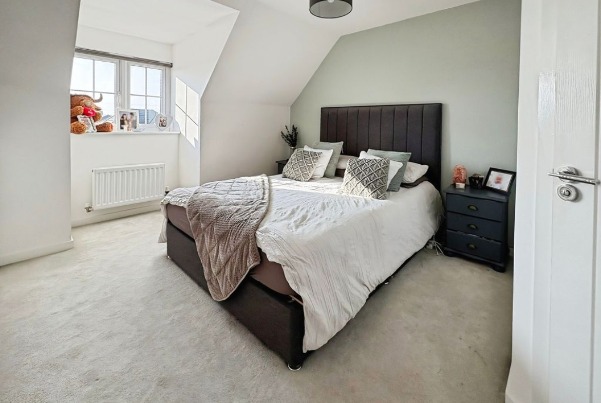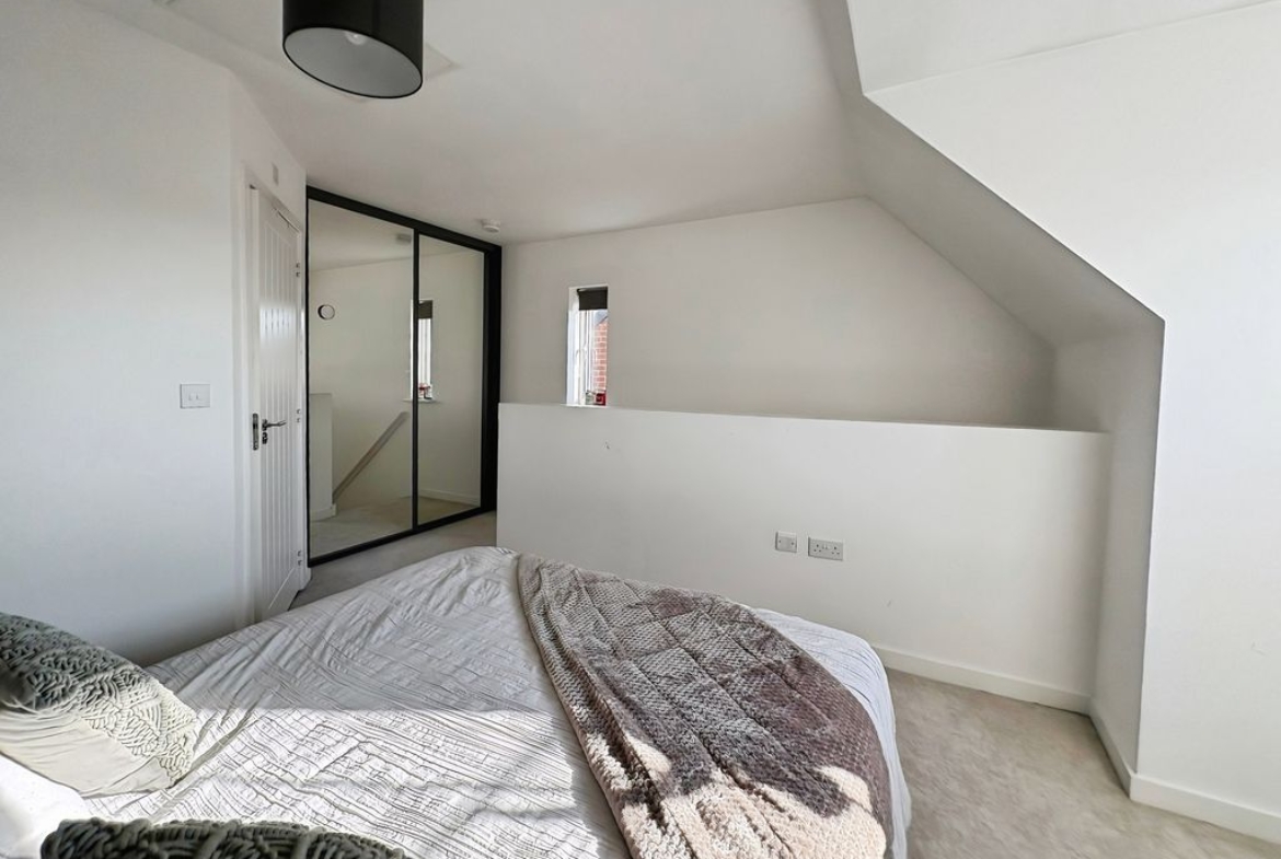 Set across three well-arranged floors, this impressive modern townhouse offers generous and versatile living space. Thoughtfully designed and beautifully presented throughout, the property combines practical accommodation with bright, well-proportioned rooms and a layout that flows effortlessly from floor to floor. The ground floor opens with an inviting entrance hallway leading into a spacious living room to the front, where large windows allow natural light to fill the space, creating a comfortable and welcoming environment. To the rear of the property is a superb dining kitchen, designed to be both practical and sociable, featuring a range of fitted units, integrated appliances and ample space for a dining table. French doors open directly onto the rear garden, creating a natural connection between indoor and outdoor living. A convenient ground floor WC completes the accommodation on this level. The first floor provides two well-proportioned bedrooms alongside a modern family bathroom finished with contemporary tiling and a shower over the bath. The bedrooms offer flexibility for a variety of uses. Occupying the entire top floor is an impressive principal bedroom suite. This generous room enjoys excellent proportions with attractive sloped ceilings and natural light from multiple windows. The space is further enhanced by fitted wardrobes and a stylish en-suite shower room, creating a private and comfortable retreat. Externally, the property benefits from an enclosed rear garden with lawn and patio seating area, offering a pleasant space for relaxing or entertaining outdoors. The property is well positioned within a popular residential development, providing convenient access to local amenities, schools and transport links Freehold, EPC: B, Council Tax Band: C, Electricity, Water, sewerage, heating mains connected, broadband: FTTP, Mobile coverage blackspot: No