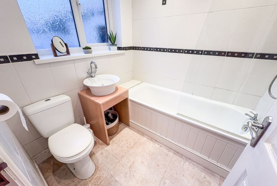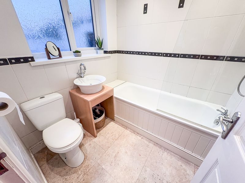 BATHROOM: Three piece suite comprising panelled bath, wash hand basin set in vanity unit, low level w.c, spotlights, part tiling to walls, radiator, double glazed window to side
