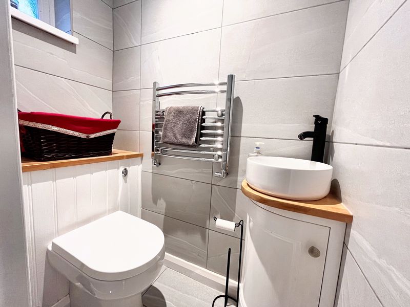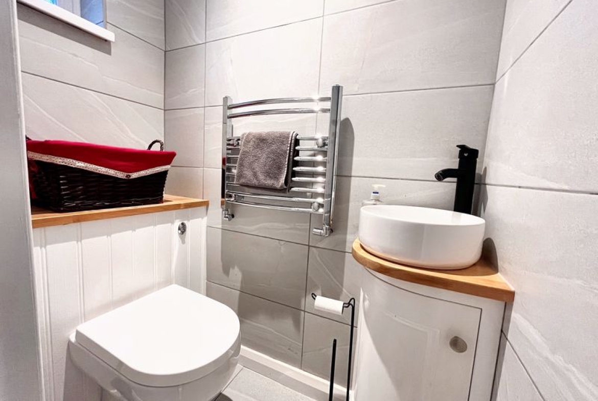 W.C with concealed cistern | Corner cabinet with mono bowl sink | Chrome ladder-style radiator | Fully tiled walls and floor | UPVC double-glazed frosted window | Ceiling downlight