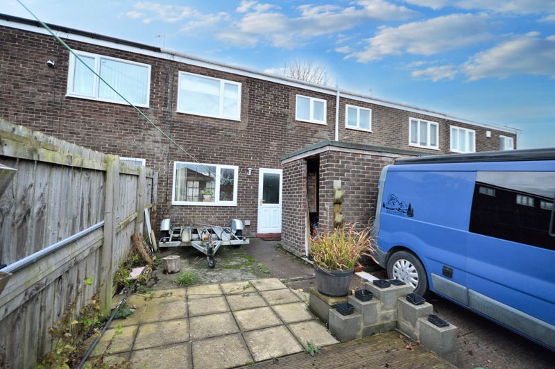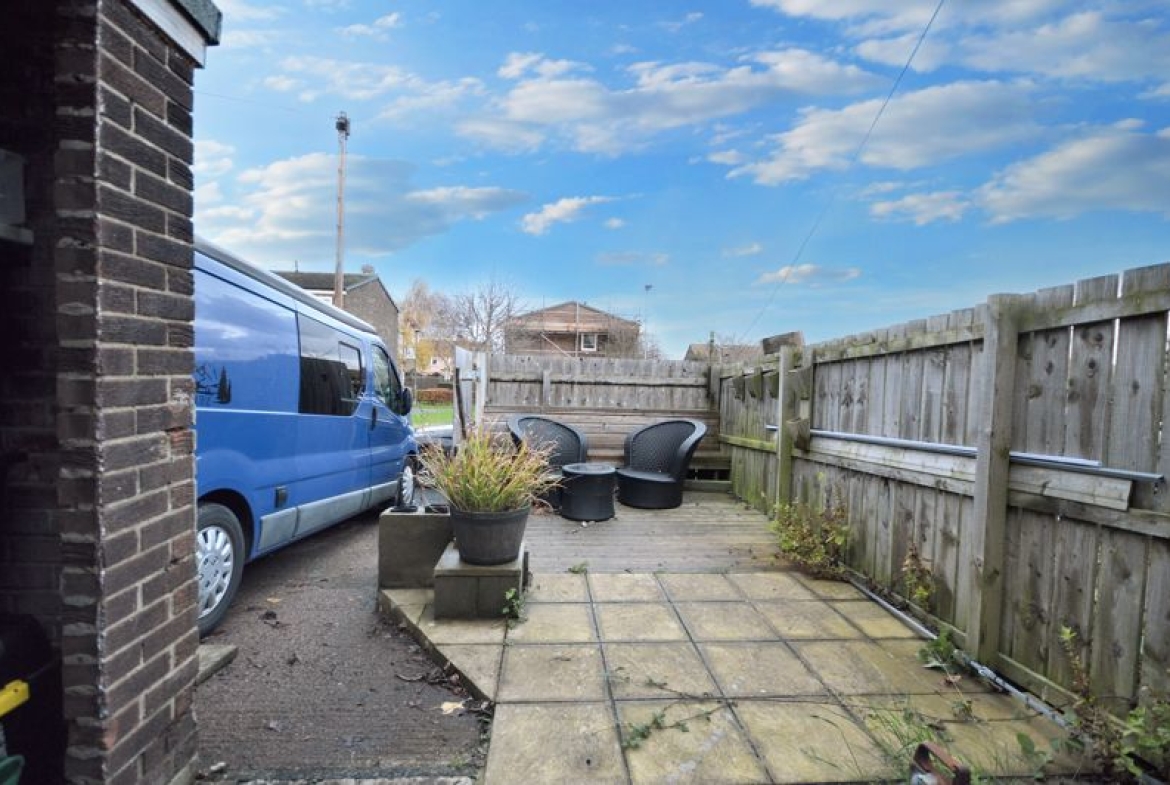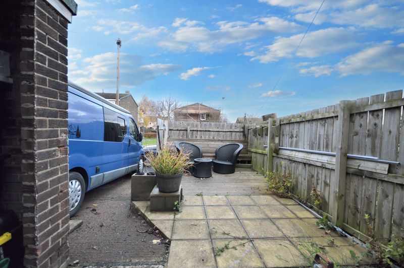 The low maintenance garden at the rear consists of paved, decked, and concrete areas, together with a concrete drive and a brick outbuilding for storage