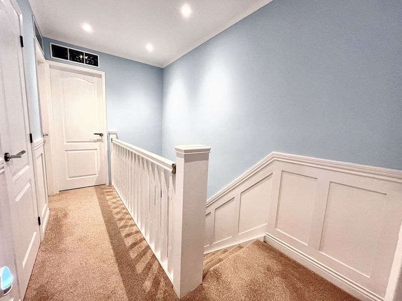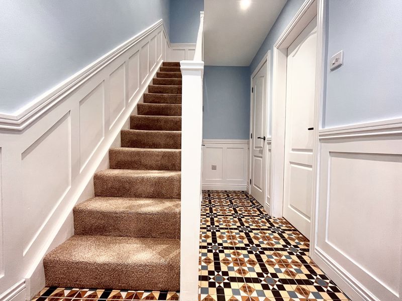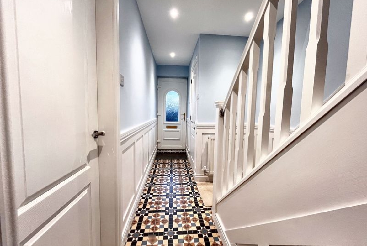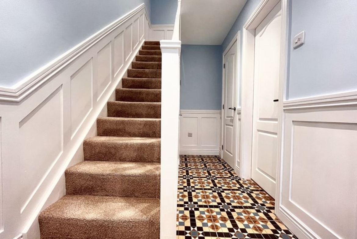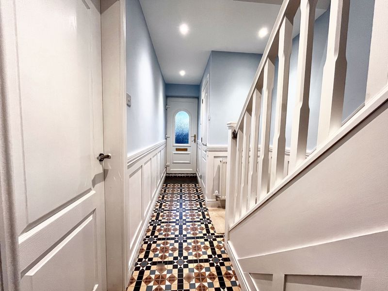 UPVC double-glazed entrance door | Decorative tiled floor | Half wall panelling | Radiator | Under-stairs cupboard | Storage cupboard | Ceiling downlights | Staircase to first floor
