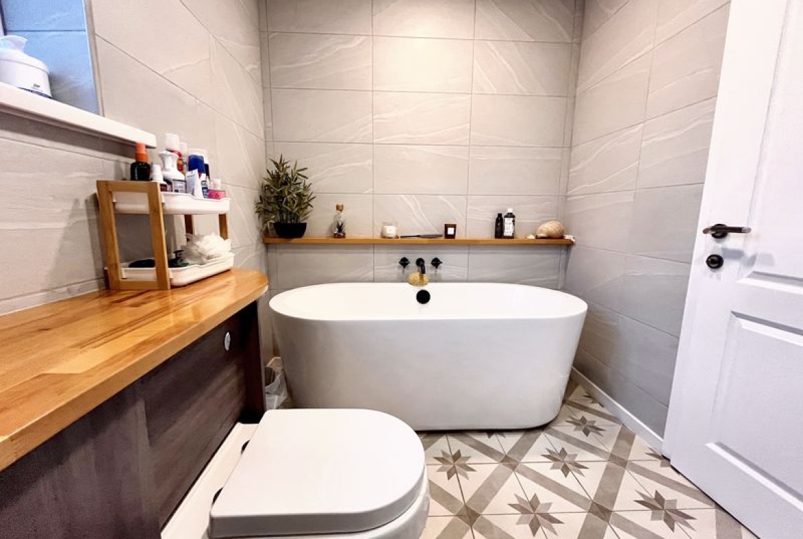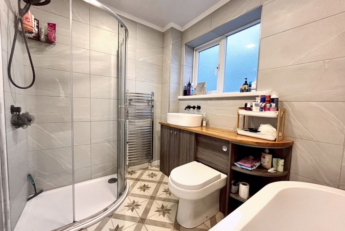 Upstairs features two double bedrooms, both with built-in wardrobes, and a single bedroom. The modern and stylish family bathroom is equipped with a free-standing bath, separate shower cubicle, electric heated floors, and a heated towel rail, catering to comfort and convenience.