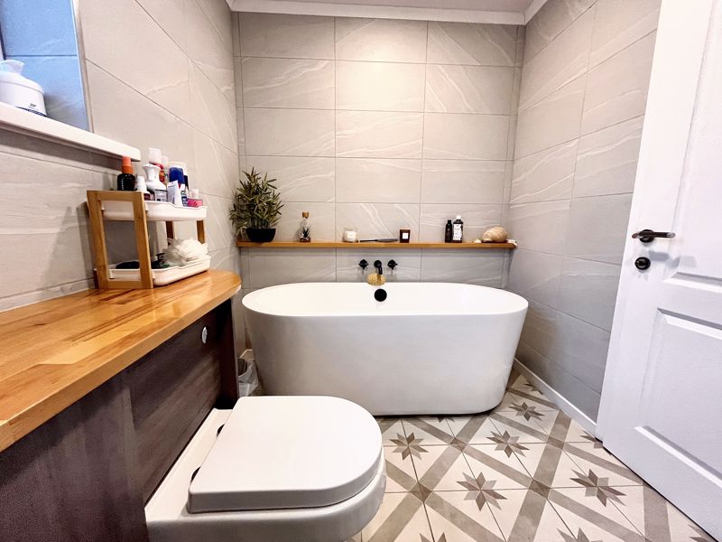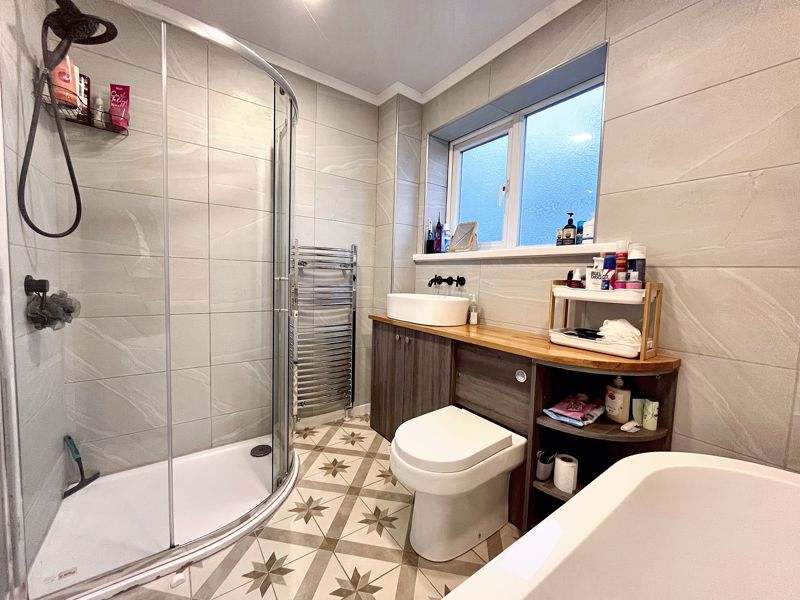 Corner tiled shower cubicle with mains shower | Double ended bath | Fitted cabinets with integrated W.C and wash-hand basin | Chrome ladder-style radiator | Fully tiled walls | UPVC panelled ceiling | Decorative tiled floor | Electric underfloor heating | UPVC double-glazed frosted window | Extractor