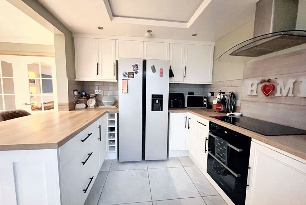 Fitted units incorporating; single sink with hose tap, Induction hob, extractor hood, double electric oven, space for American fridge freezer, space for washing machine