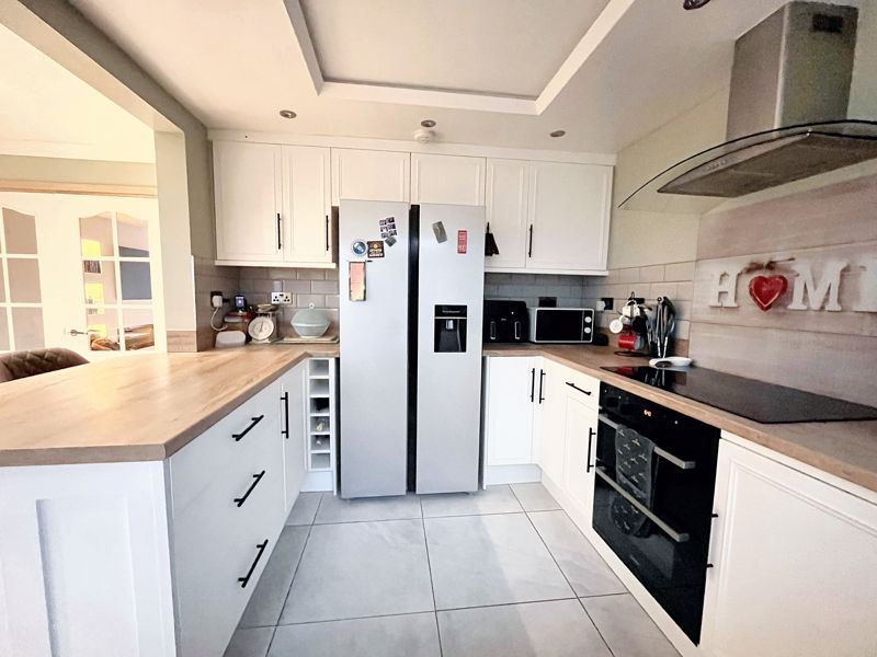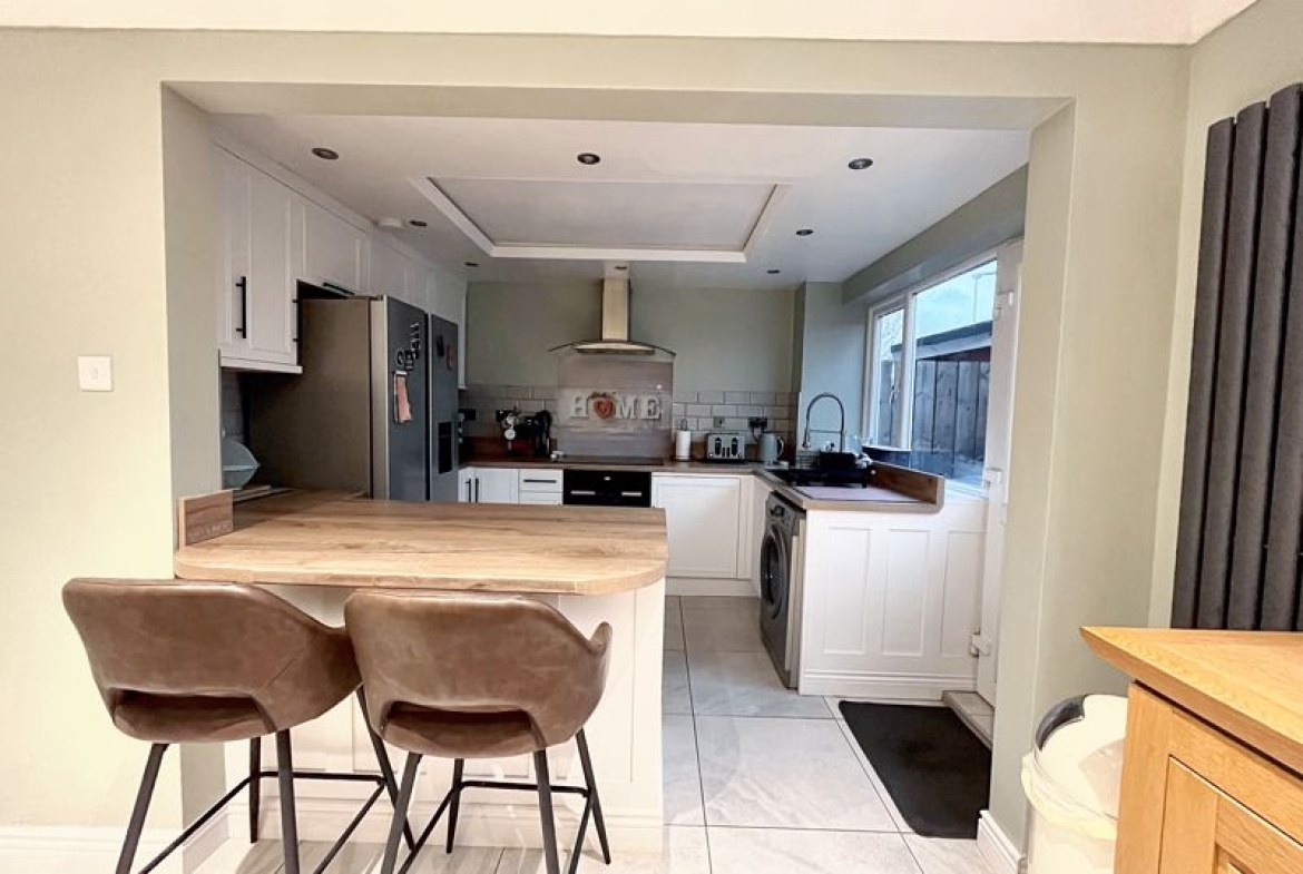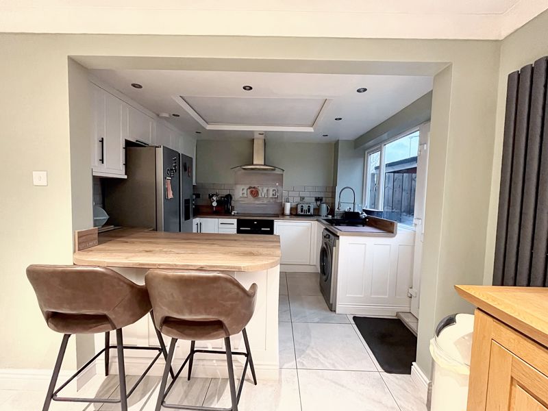 UPVC double-glazed windows and rear external door | Tiled floor | Part tiled walls | Ceiling downlights and feature lighting | Open to dining room