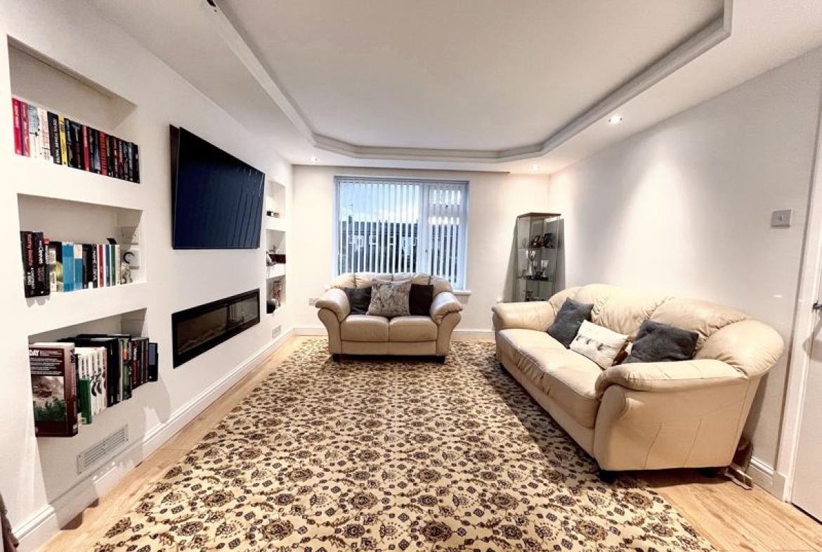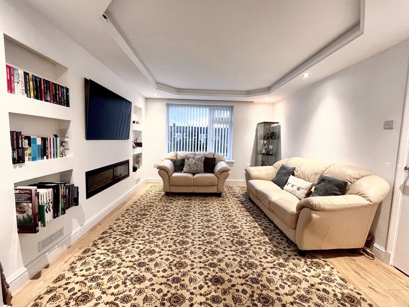 UPVC double-glazed window to front | Media wall with integrated electric fire and display shelves with feature lighting | Laminate floor | Ceiling downlights and feature lighting