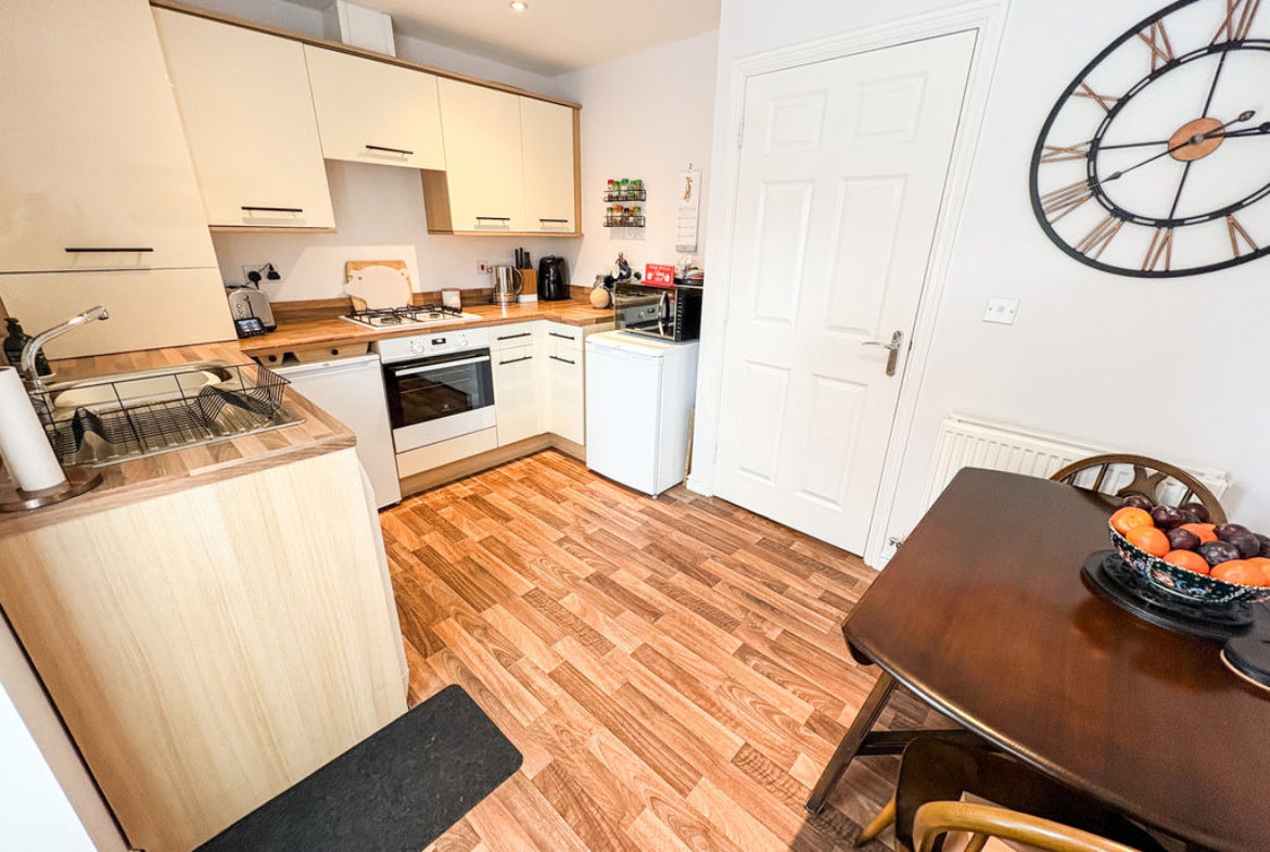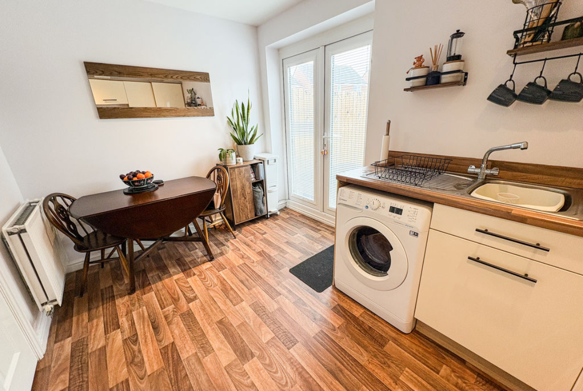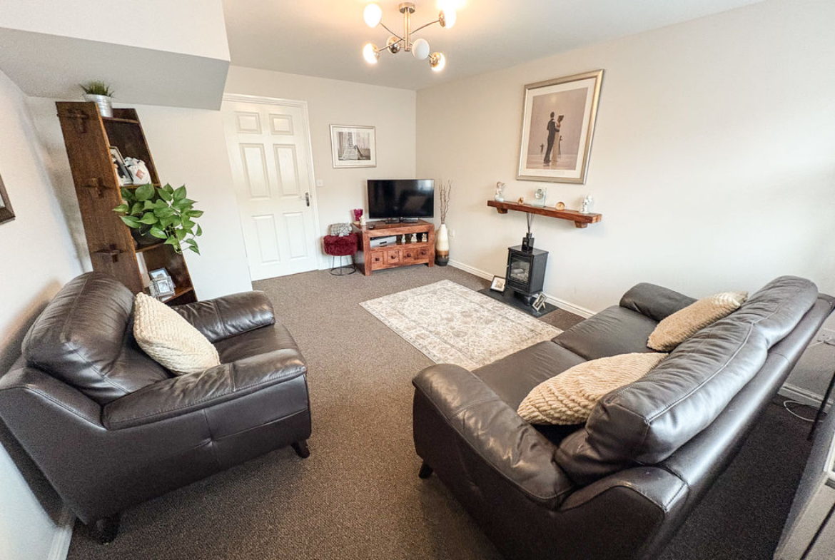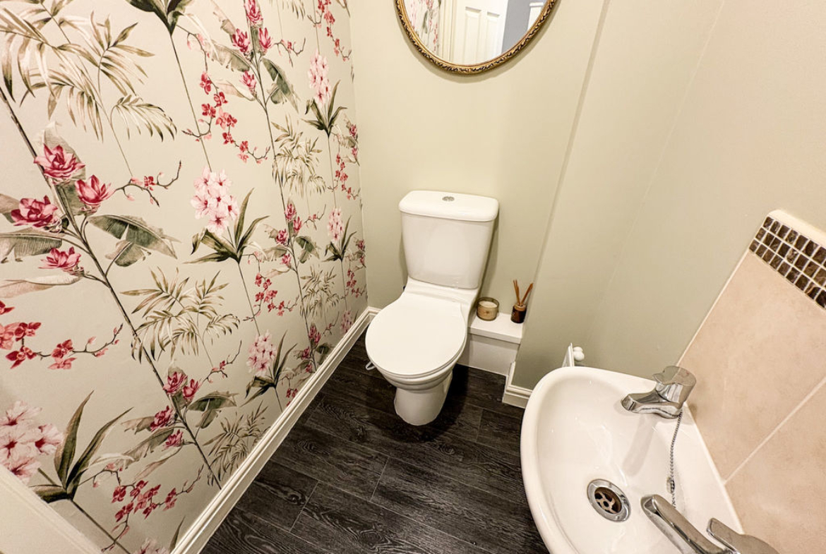 Upon entering, you are greeted by a bright and airy lounge—an inviting space to relax and unwind. The well-designed kitchen is both stylish and practical, featuring an array of attractive wall and base units that provide ample storage. Double patio doors open out onto the rear garden, creating a seamless indoor-outdoor flow that’s perfect for entertaining. A convenient ground floor WC completes this level.