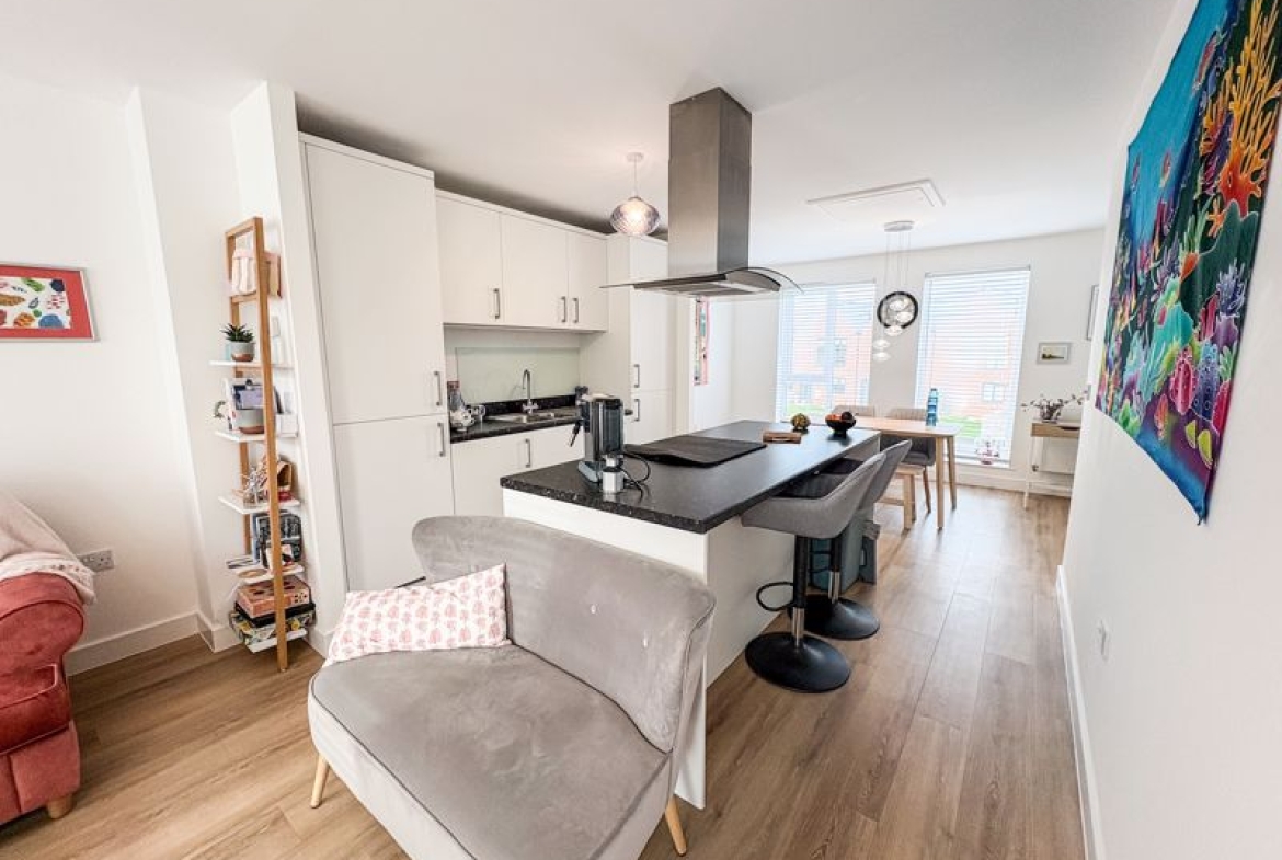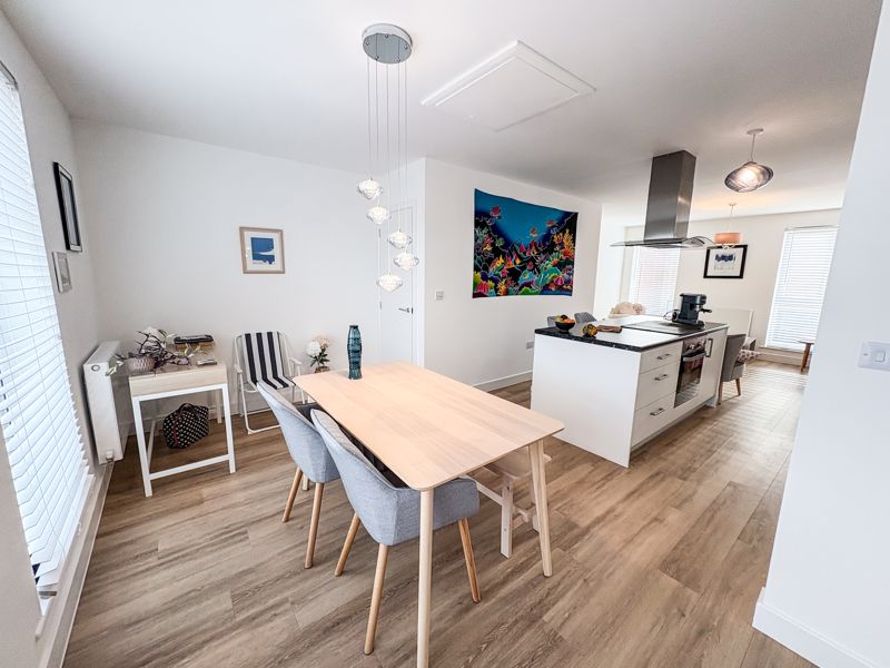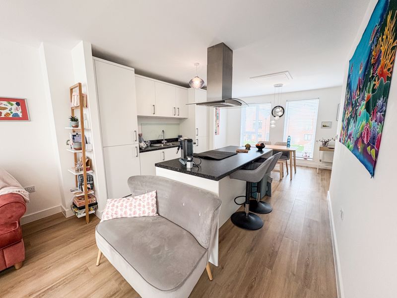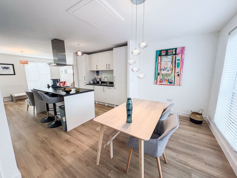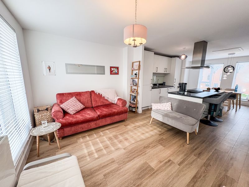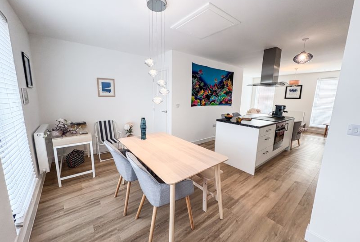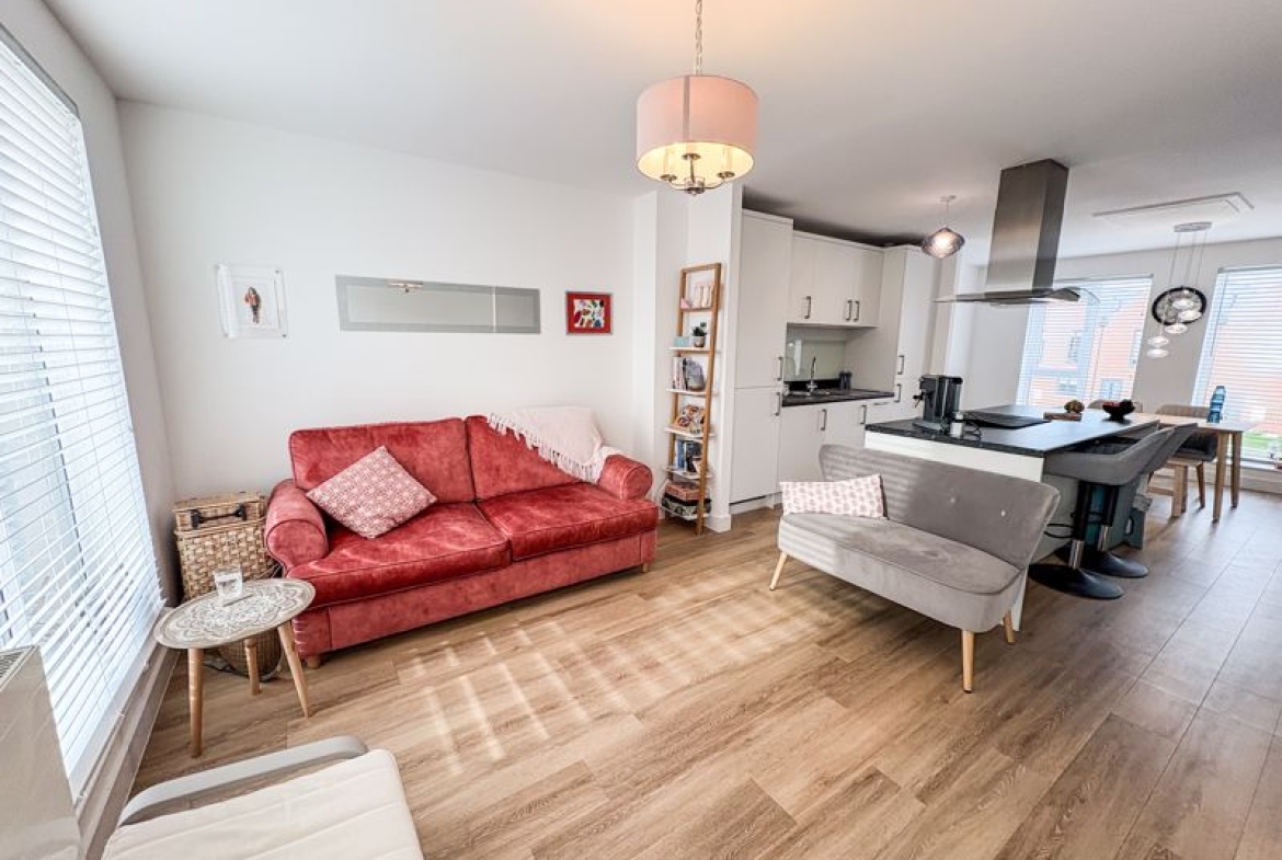On the ground floor, a welcoming hallway leads to two beautifully presented bedrooms and a modern family bathroom, each designed with a calm, coastal-inspired palette. Upstairs, the heart of the home awaits—a stunning open-plan living, kitchen, and dining space featuring a stylish centre island and a range of integrated appliances, perfect for modern living. Generous windows fill the room with natural light, creating an ideal setting for relaxing or entertaining while enjoying glimpses of the nearby river.