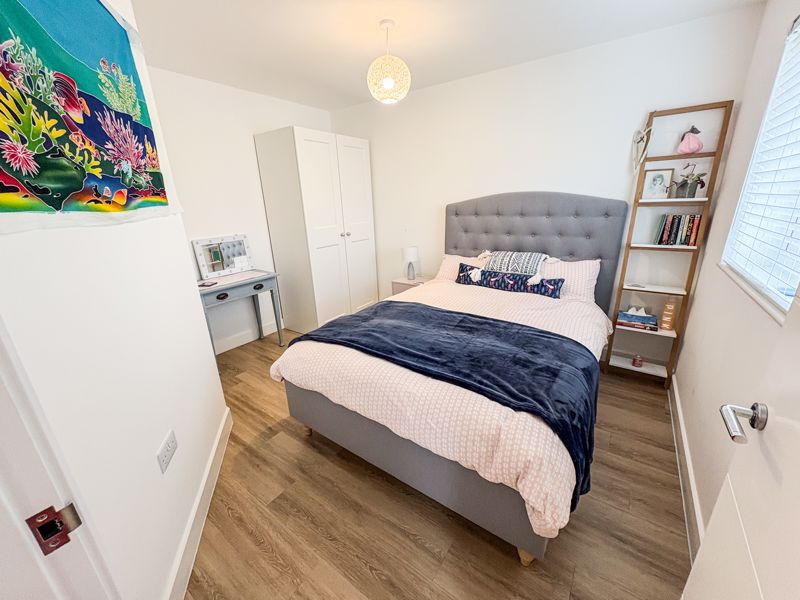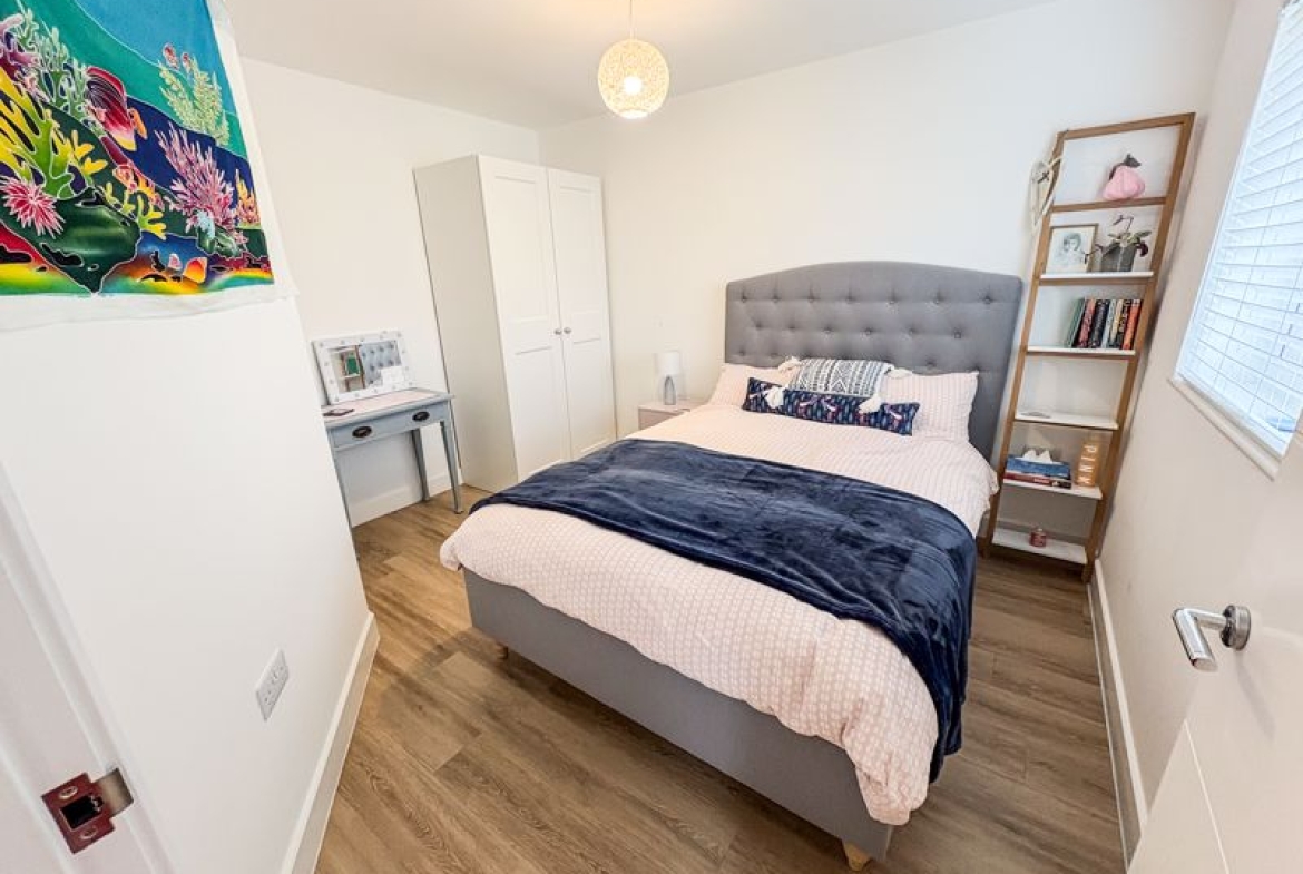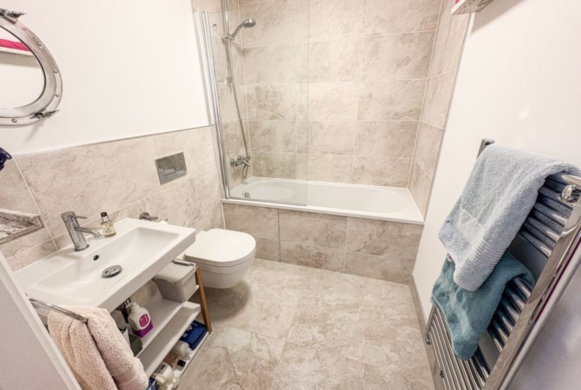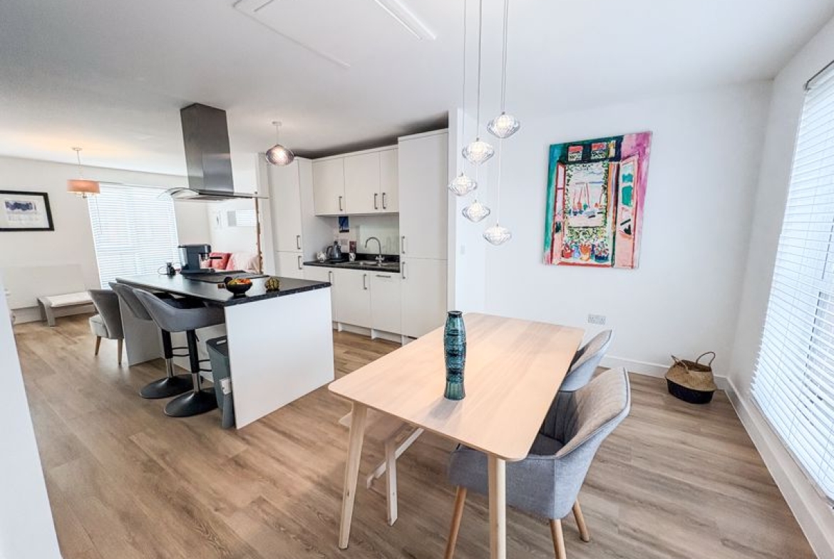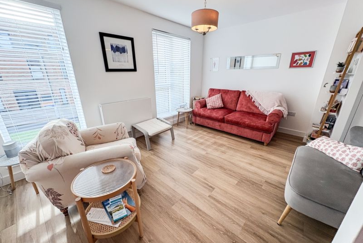 On the ground floor, a welcoming hallway leads to two beautifully presented bedrooms and a modern family bathroom, each designed with a calm, coastal-inspired palette. Upstairs, the heart of the home awaits—a stunning open-plan living, kitchen, and dining space featuring a stylish centre island and a range of integrated appliances, perfect for modern living. Generous windows fill the room with natural light, creating an ideal setting for relaxing or entertaining while enjoying glimpses of the nearby river.