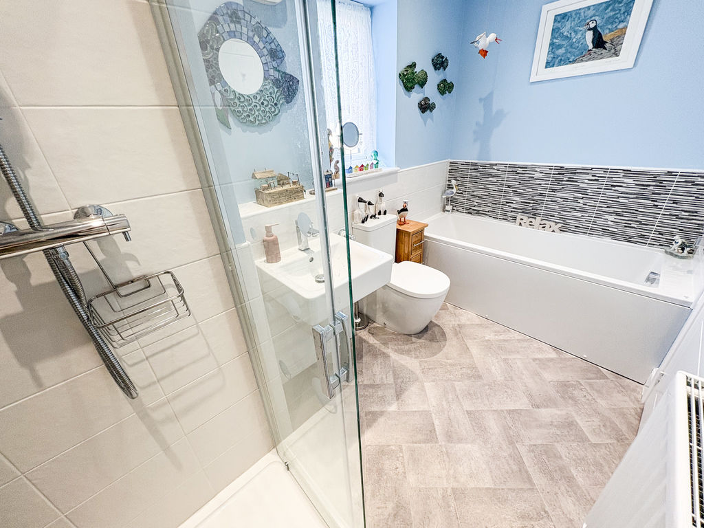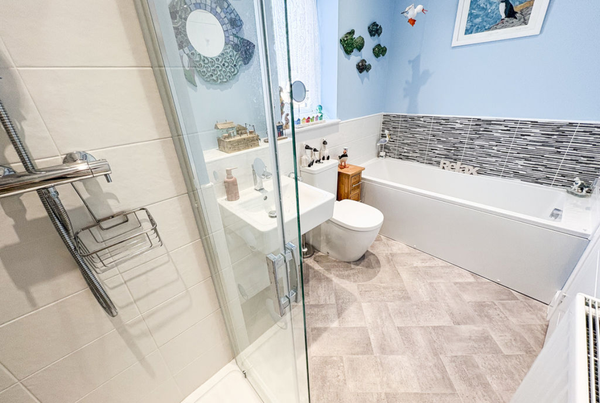 FAMILY BATHROOM: 4 piece suite comprising panelled bath, pedestal wash hand basin, shower cubicle, low level wc, double glazed window to rear, double radiator, and part tiling to walls.