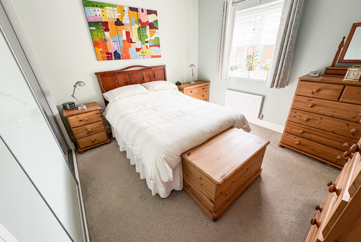 BEDROOM ONE: (front): 9’25 x 12’18, (2.81m x 3.71m), double glazed window to front, double radiator, and fitted wardrobes.