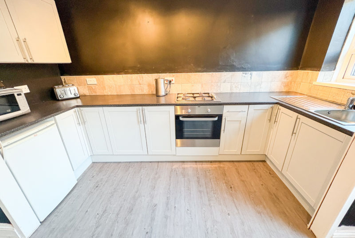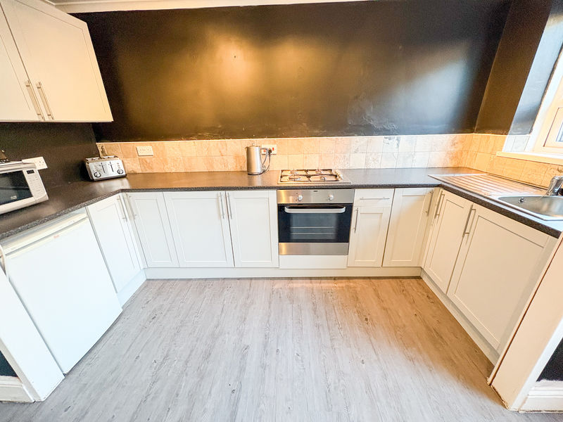 Range of wall, floor and base units with coordinating roll edge work surfaces, stainless steel sink unit and drainer with mixer taps. Built in electric oven and gas hob and space for fridge/freezer. Double glazed window to the rear, single radiator and built in cupboard.