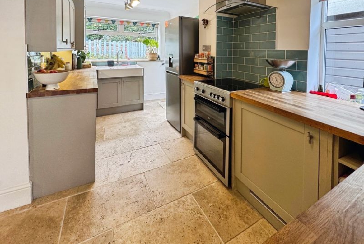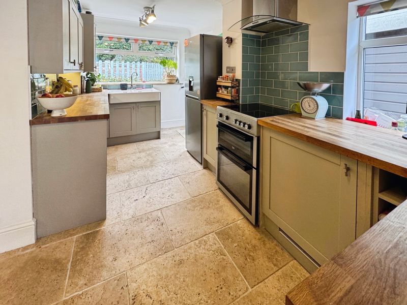 Two UPVC windows, UPVC door, fitted with a range of matching wall and base units with solid wood work surfaces above incorporating double Belfast sink unit, tiled splash backs, electric free-standing cooker, integrated washing machine and tumble dryer, tiled floor, under floor heating, dining space and radiator.