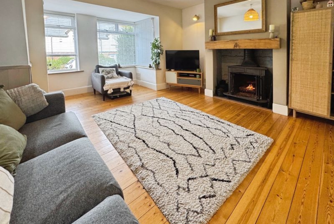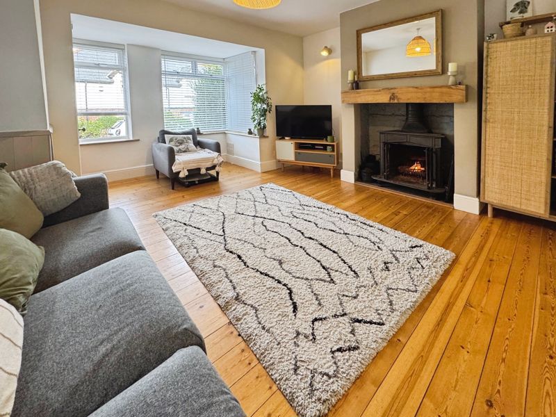 UPVC bay window to the front, Inglenook with multi fuel burner, solid wood flooring and radiator.