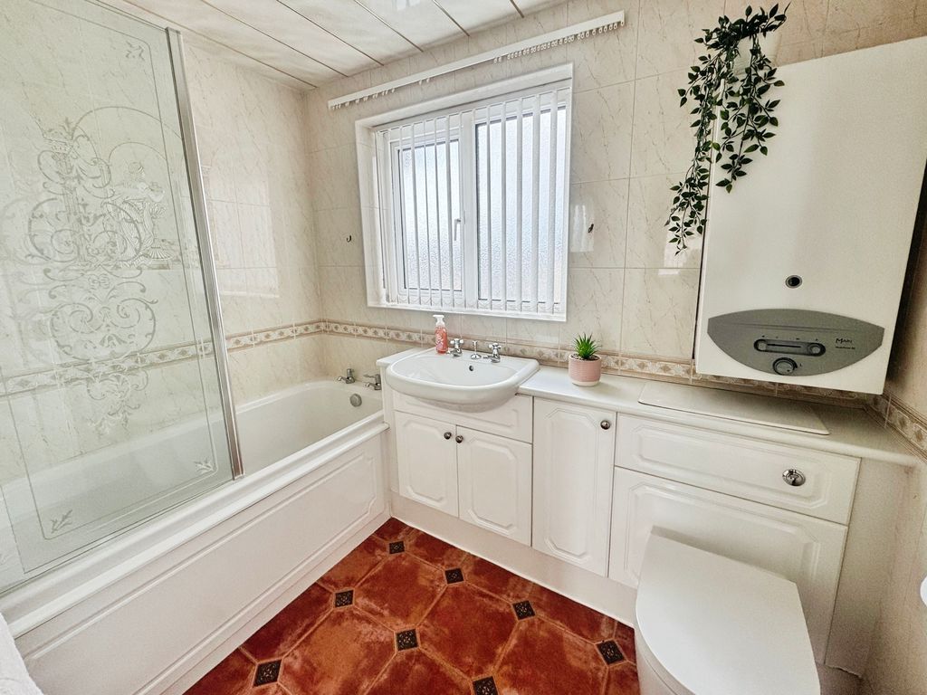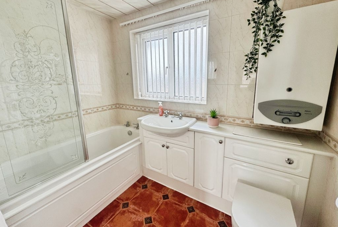 UPVC window, bath with shower, comfort height wc, vanity wash hand basin and radiator.