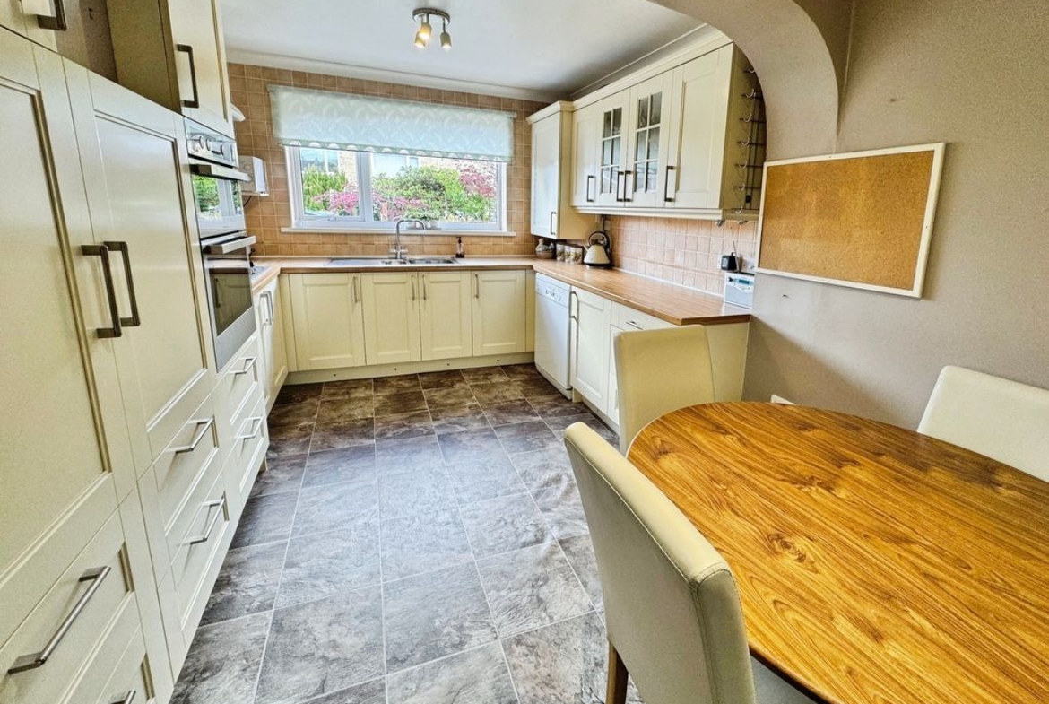Extended. UPVC window, fitted with a range of matching wall and base units with work surfaces above incorporating one and a half bowl sink unit with drainer, integrated gas hob, integrated electric oven with grill, extractor hood, integrated fridge, plumbed for washing machine, Pantry, dining space and radiator.
