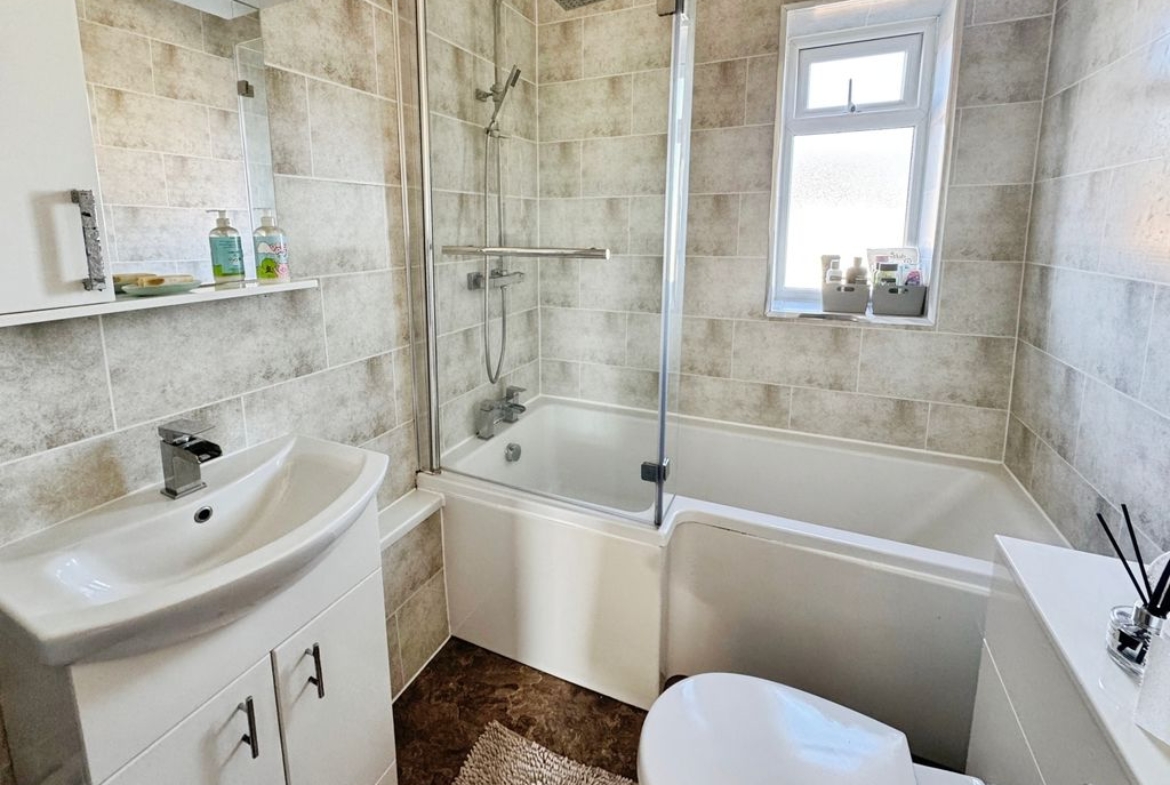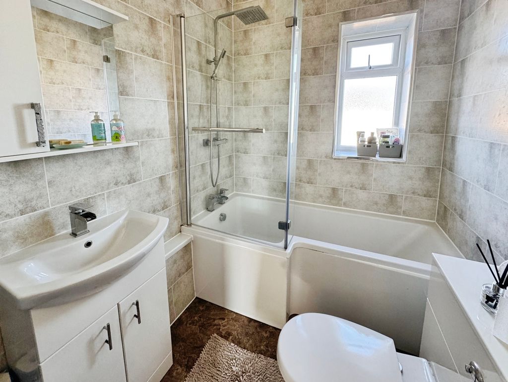 UPVC window, bath with shower, low elvel wc, vanity wash hand basin, fully cladded and heated towel rail.