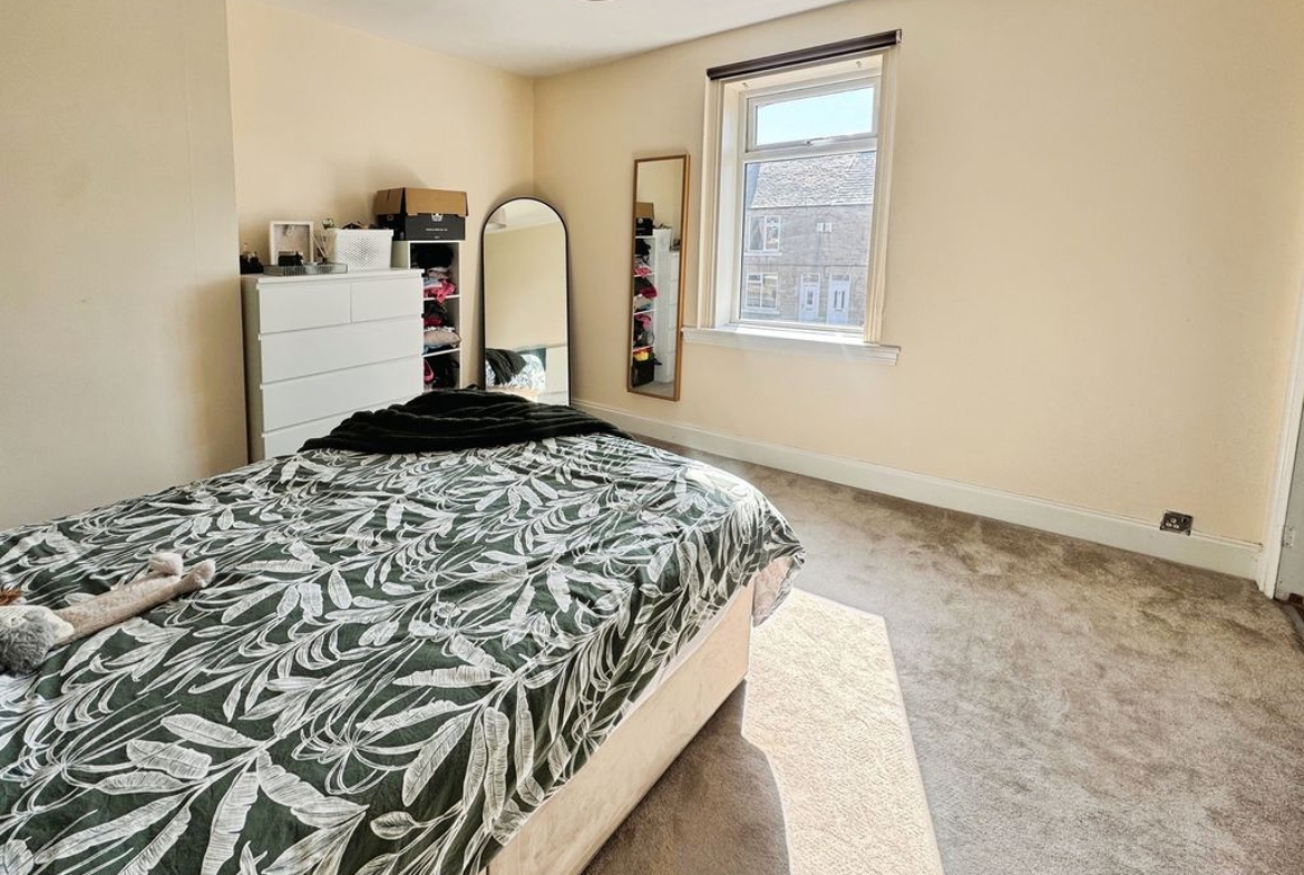 The ground floor includes a reception room with large windows and a fireplace, creating a central living area with natural light. The kitchen offers dining space, providing an area for everyday meals and informal entertaining. Upstairs, there are two double bedrooms, one of which benefits from a walk-in wardrobe, offering useful storage. The bathroom includes a shower over bath. Outside, there is a front garden and a rear yard, adding private outdoor space.