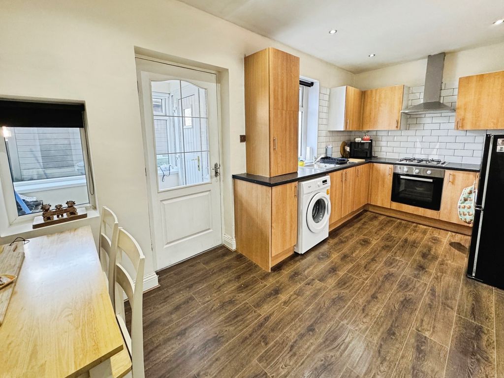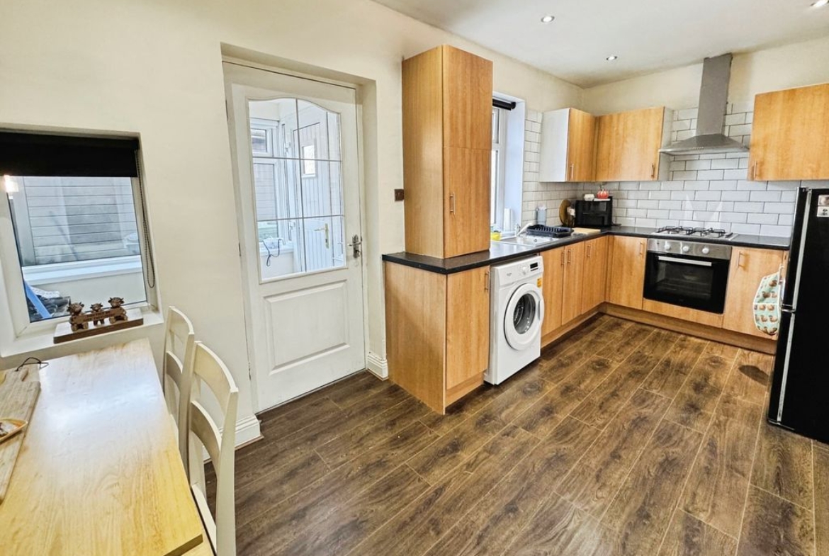 Fitted with a range of matching wall and base units with work surfaces above incorporating stainless steel sink unit with drainer, integrated gas hob, electric oven with extractor hood, plumbed for washing machine, dining space and radiator.
