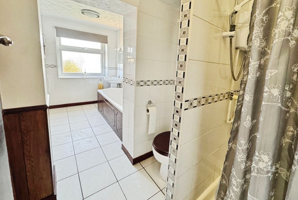 UPVC window, bath, shower, low level wc, wash hand basin, part tiled and radiator.
