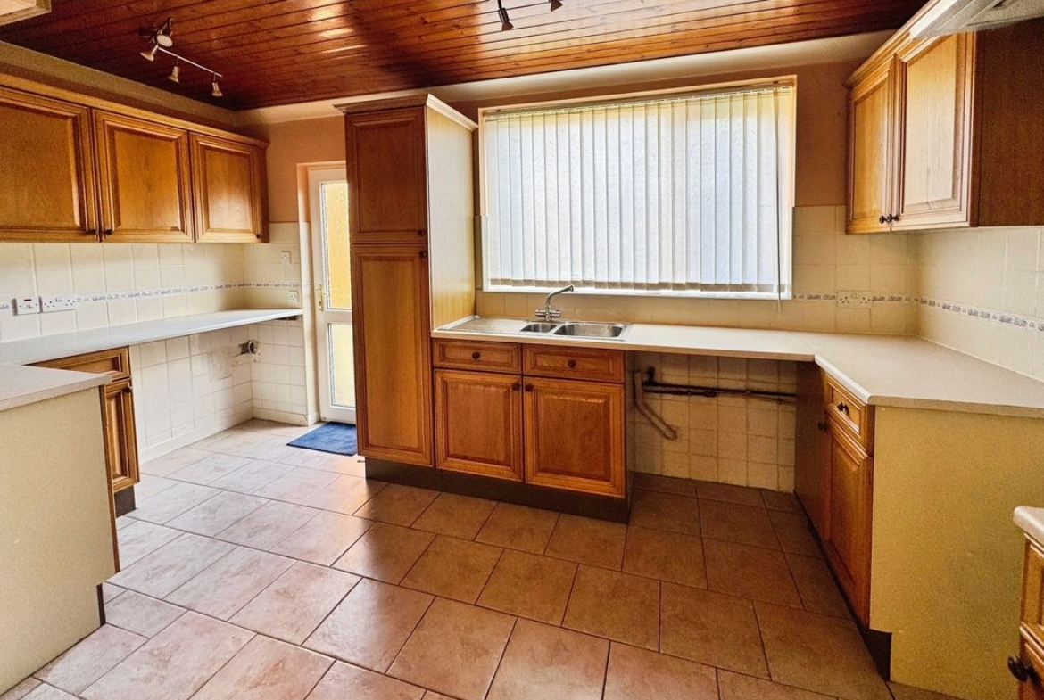 UPVC window, UPVC door, fitted with a range of matching wall and base units with work surfaces above incorporating one and a half bowl sink unit with drainer, open plan to;