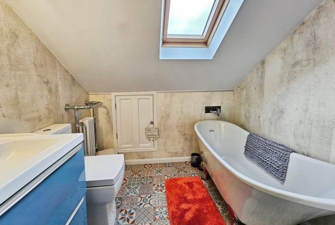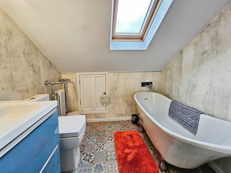 High level wc, wash hand basin set in vanity unit, roll top bath, storage cupboard, skylight, radiator.